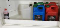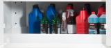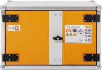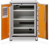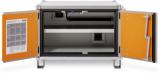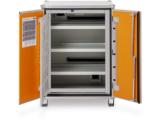 Paloturvakaapin ovet pysyvät auki kaikissa asennoissa (sulkeutuvat automaattisesti tulipalon sattuessa). Poistoilmaliitäntä (DN 75) kaapin katossa. Liitäntä kiertoilmakoneeseen tai omaan poistoilmalaitteseen. Nestetiivis, testattu (teräsallasdirektiivin mukainen) pohja-allas, teräspelti jauhemaalattu, sis. reikäpeltikannen lisävarastotasona.