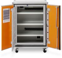 2-värikonsepti modernia ja yksilöllistä yleisilmettä varten: runko antrasiitinsininen (RAL 7016), ovet saatavissa harmaana tai keltaisena. Ovet lukittavissa lukolla, lukitustilan näyttö (punainen/vihreä). Sisältää 3 hyllytasoa, korkeutta voidaan säätää 32 mm välein. Säätöjalat alustan epätasaisuuksien tasaamiseen. Pohja-allas on helppo irrottaa, ja sen kolmella reunalla olevat huuliprofiilitiivisteet keräävät valuvat nesteet turvallisesti talteen. Pariovet aukeavat 90 astetta, kaapin sisus on täysin näkyvillä. Oven väri: huomiokeltainen, RAL 1004. Oven kätisyys, vasen.