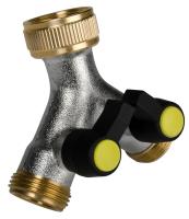 Jakoventtiili jossa sulut. Tuloaukko 1×¾" sisäkierre, sisäpuolinen mutteri. Poisto 2×¾" ulkokierre suluilla.