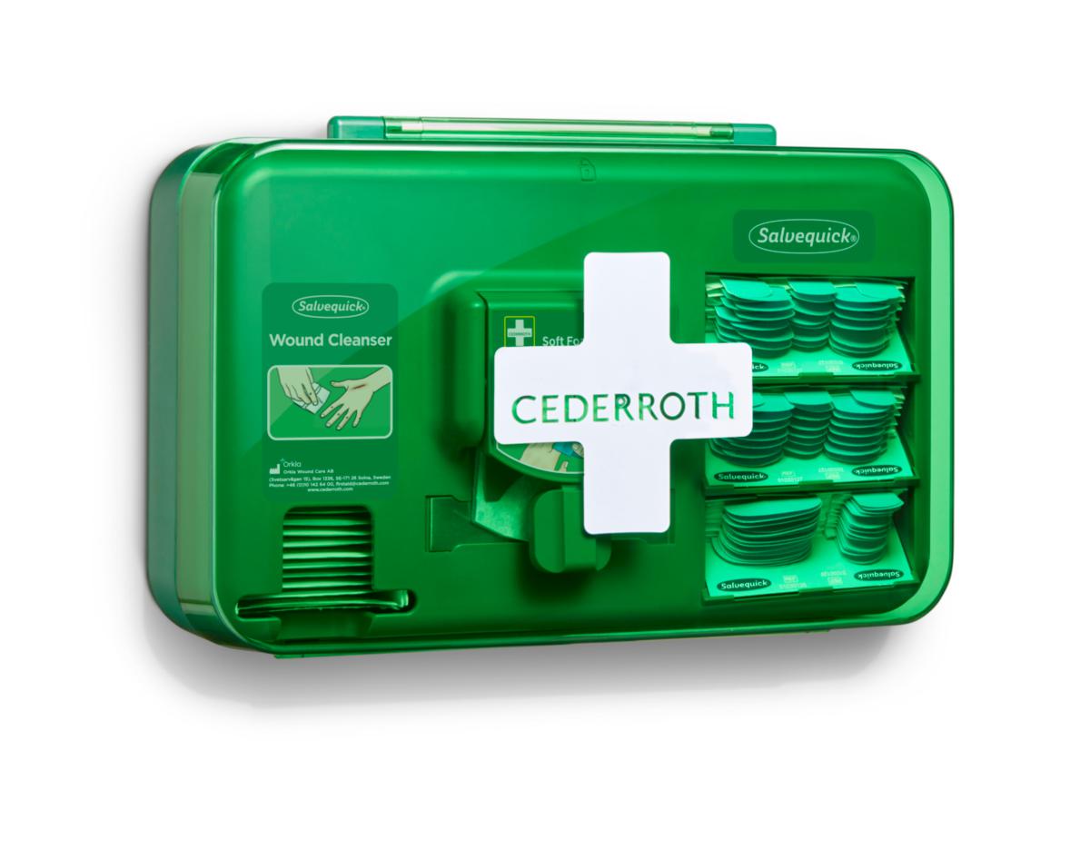 Cederroth Haavanhoitoautomaatti Blue on suunniteltu etenkin elintarviketeollisuuden ja keittiöiden käyttöön. Haavanhoitoautomaatissa on kätevästi kaikki mitä tarvitset pienten haavojen hoitoon. Sisältää sinistä, itsekiinnittyvää ja vedessäkin pysyvää, Soft laastaria sekä eri kokoisia, sinisiä elintarvikelaastareita, jotka voidaan jäljittää useimmissa elintarviketeollisuudessa käytettävissä metallintunnistimissa. Lisänä haavapyyhkeet haavan puhdistukseen. Laastarit ovat käyttövalmiina ja helposti otettavissa lialta ja kosteudelta suojaavan kannen alla.Tuotteet ovat lukittuna automaatissa ja vaihdetaan mukana tulevan avaimen avulla. Kätevä ratkaisu ensiapuasemien täydentäjänä työpisteissä, joissa laastareiden tarve on ilmeinen. Vuodesta 2022 alkaen haavanhoitoiautomaatin vihreät osat valmistetaan >85%:sti kierrätetystä muovista.