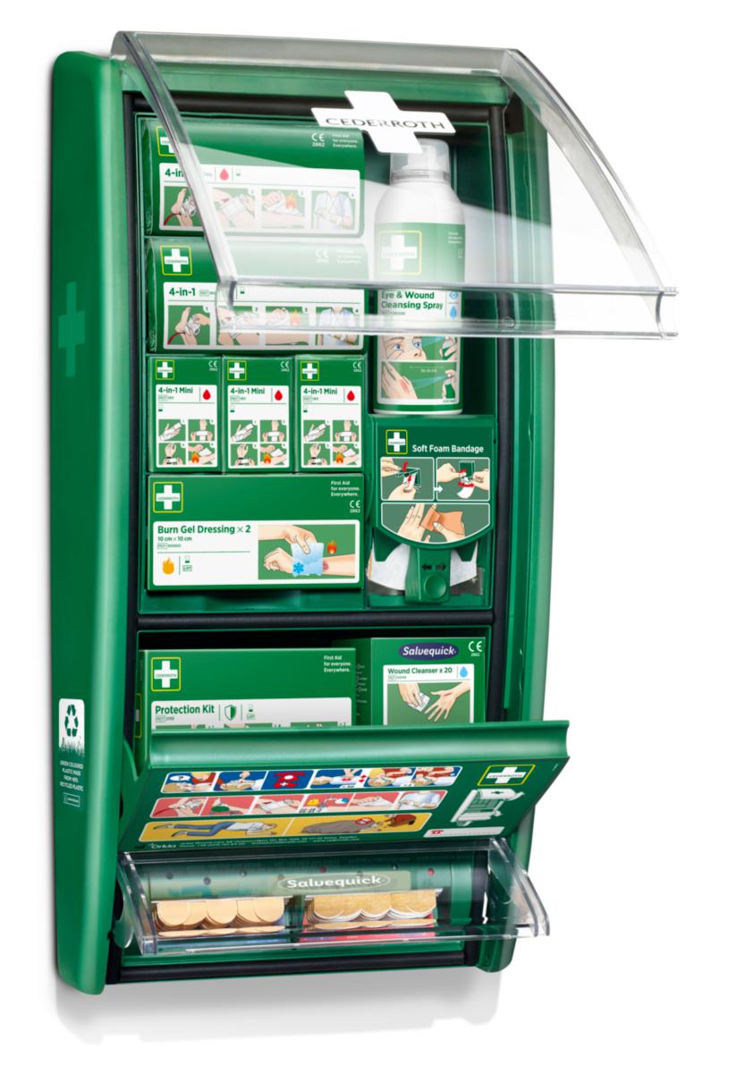Ensiapuasemasta löytyy tarvikkeet monenlaisten vammojen ensiapuun, kuten erityyppisiin haavoihin, palovammoihin sekä silmänhuuhteluun. Myös laastariautomaatit Soft Foam laastarille sekä tavallisille laastareille.Tarvikkeet ovat läpinäkyvän kannen ansiosta selkeästi havaittavissa ja täydennystarpeet näkee yhdellä silmäyksellä. Pöly- ja roiskesuojattuna se soveltuu haastaviinkin olosuhteisiin. Ensiapuasemassa myös lokerikko täydennystarvikkeille.Tuotteissa kuvalliset käyttöohjeet. Vuodesta 2022 alkaen ensiapuaseman vihreät osat valmistetaan > 85%:sti kierrätetystä muovista.