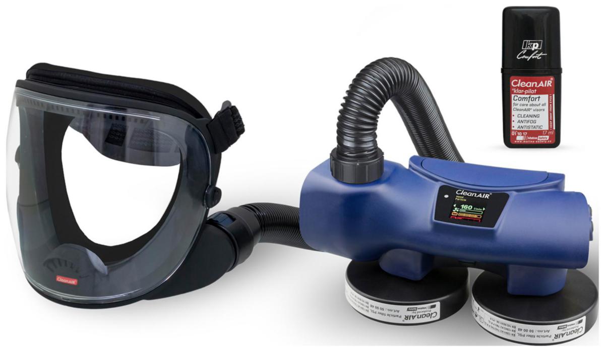 Paketti sisältää: Puhallinsuojain CleanAIR Chemical 2F, Kasvonsuojain CleanAIR UniMask helposti puhdistettavalla neopreenitiivisteellä ja CleanAIR Klar-pilot puhdistusneste (17 ml). Tuotteet pakattu kätevään muovisalkkuun.