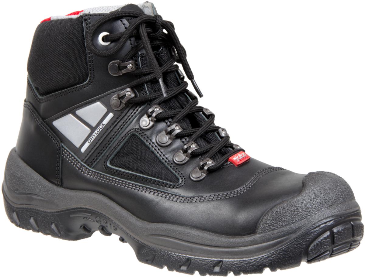 Nilkkurimallinen turvakenkä alumiinikärjellä ja teräsvälipohjalla. Vedenpitävä Drylock-kalvo. Kärkikuppi. Pitävä kuumankestävä GRIP-kumipohja. Uusi kaksoisvaimennettu Fx2-pohjallinen sekä näkyvät heijastimet sivussa. EN ISO 20345, S3 WR HRO SRB