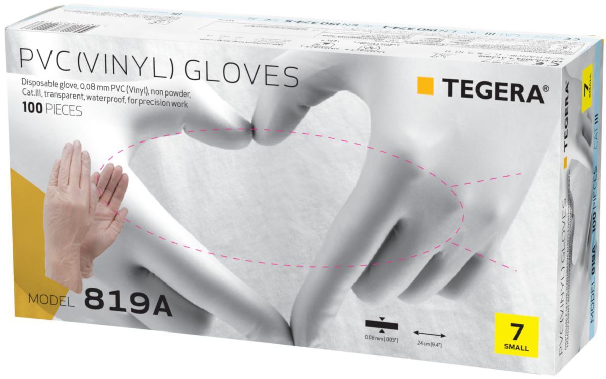 TEGERA 819 on joustava kertakäyttökäsine, joka on hyväksytty lääketieteelliseen käyttöön luokituksella AQL 1,5. Se muodostaa minimaalisen allergiariskin, koska se on silikoniton ja kromiton, ja sopii herkkäihoisille. Käsine on läpinäkyvä ja puuteroimaton. Pakattu sadan kappaleen rasioihin.