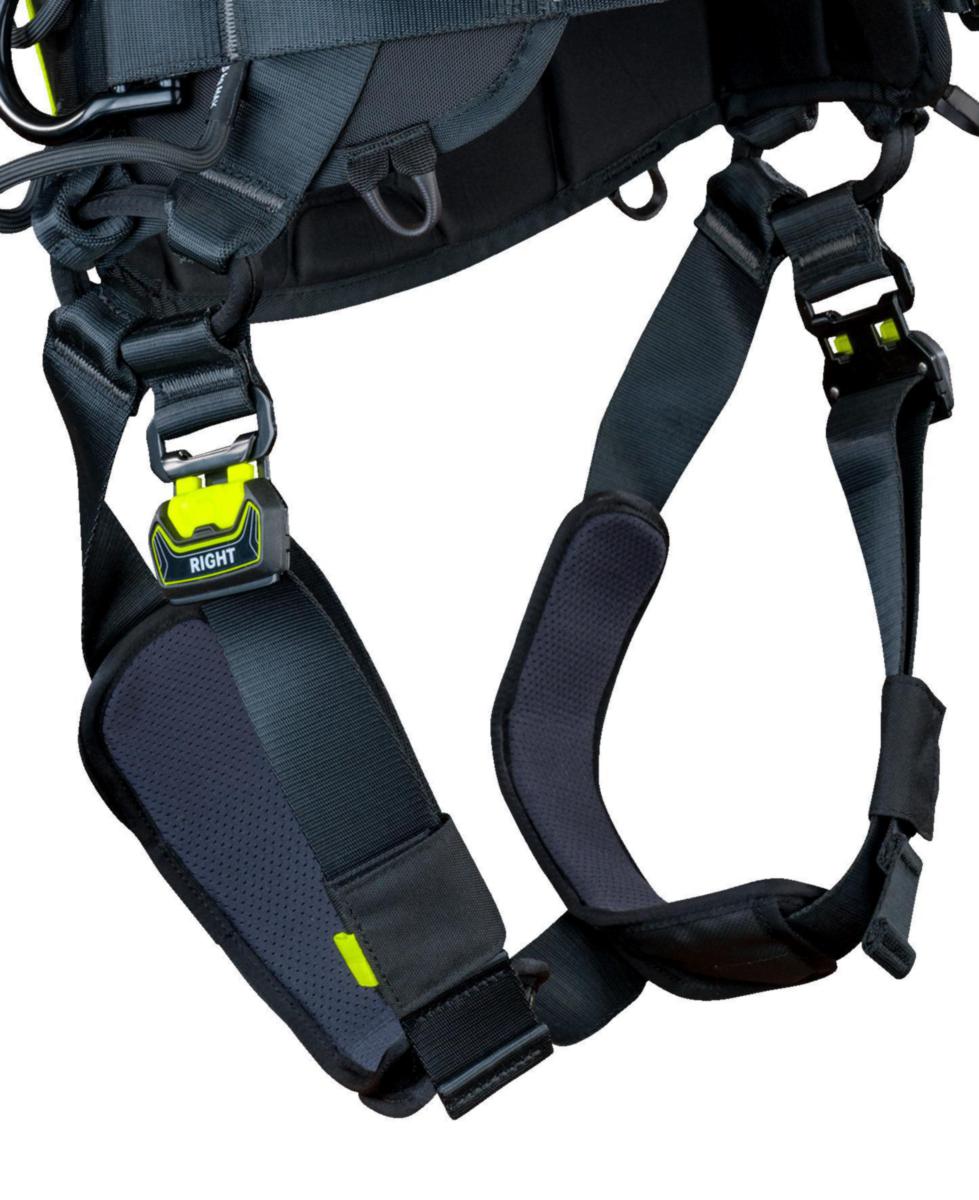 Valjaat on helppo pukea, ja pikasoljelliset jalkalenkit sekä pikasoljellinen etukiinnitys tekevät käytöstä nopeaa. Putoamisen pysäyttävän järjestelmän kiinnityspisteet rinnassa ja selässä.