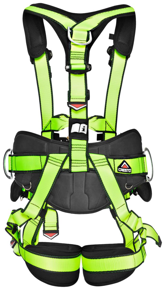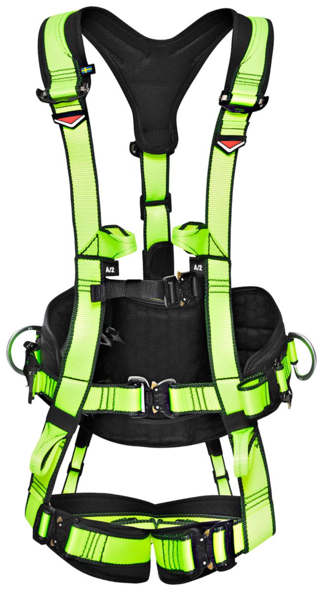 Putoamissuojain kiinnitetään rintaan, kangassilmukatPutoamissuojain kiinnitetään selkäpuolelle, galvanoitu D-rengas. Kiinnityspiste matala, tukiköydelle, kangassilmukat. Ergonominen tukivyö, jossa galvanoidut D-renkaat, asennon tukemista varten. Selkäpehmuste hengittävää materiaalia. Mukava istuma-asento jalkapehmusteiden ansiosta. Vyörenkaat karbiinihakoja ja tarvikkeita tai työkalulaukkua. Automaattiset pikasoljet jalkahihnoissa, Cobra. Kudottu polyesterihihna, 45 mm, enemmän kuin 30 kN hihnan vahvuus. Keltainen huomioväri parantaa näkymistä.
