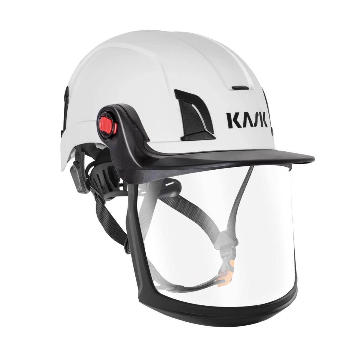 Valmis setti, jossa Kask Zen FF Visor kirkas kokokasvosuojain (WVI00008-500), Zen FF Visor Carrier yläkehys (WAC00010-), sekä Zenith Visor Adapters EasyClick pikakiinnikepari (WAC00009-) kehyksen kiinnittämiseksi Kask Zenith -sarjan työkypäriin.