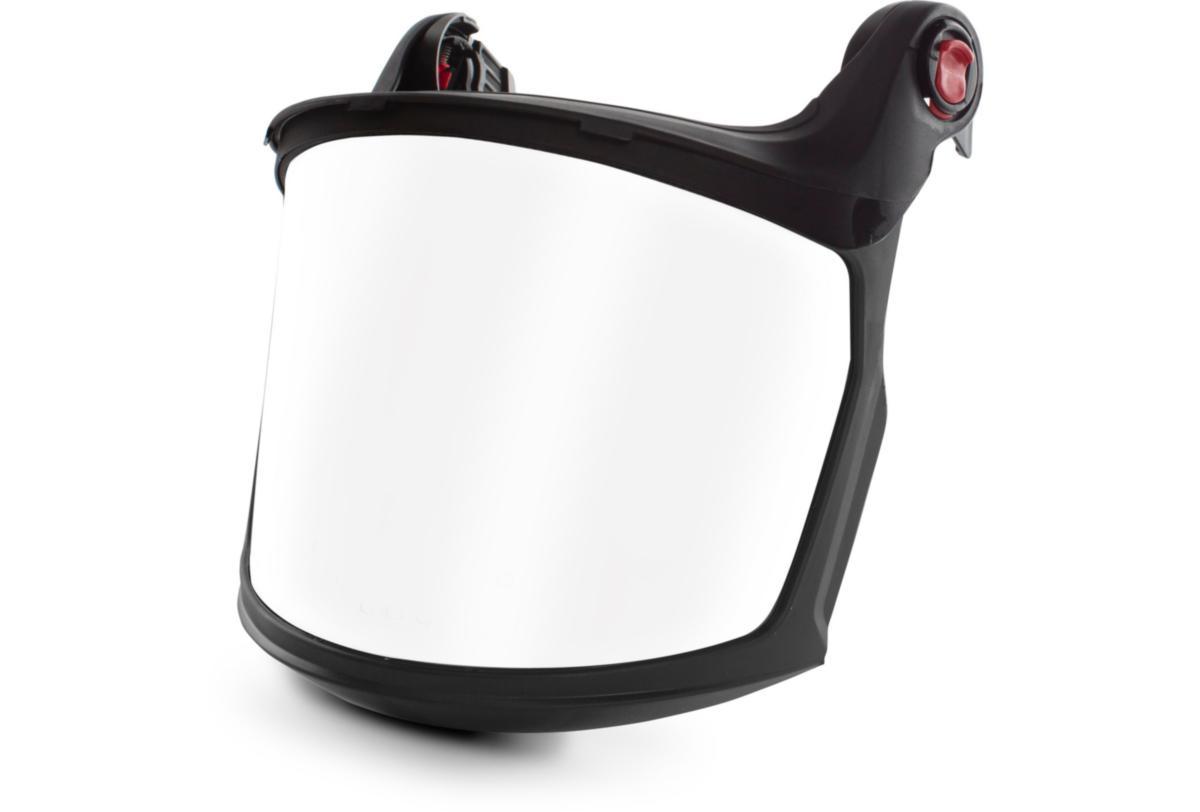 Kaksi asentoa: Nostettuna kypärän päälle kuljetusasentoon sekä laskettuna alas silmien eteen työasentoon. Yläreunassa kumireunus ehkäisee vesipisaroiden valumista kasvoille, ja alareunuksen pyöreä viimeistely tekee käytöstä miellyttävää ja ihoturvallista.