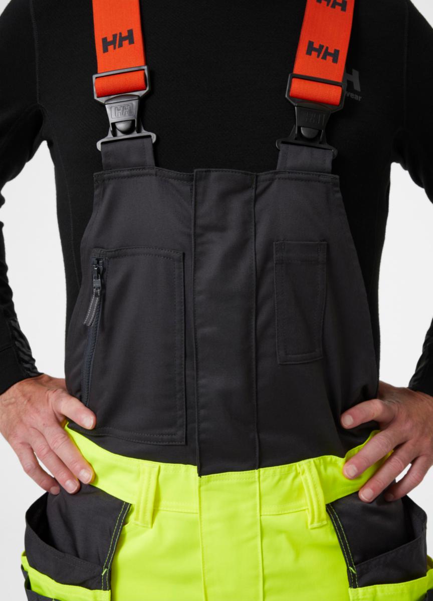 Joustava avohaalari riipputaskuilla esimerkiksi rakennustöihin ja muihin kohteisiin, joissa tarvitaan huomiovaatetusta (lk 2). Cordura®-vahvisteiset riipputaskut ja mittatasku. Polvissa Cordura®-vahvikkeet sekä säädettävät polvisuojataskut. Lahkeissa 5 cm pidennysvara pitkille käyttäjille.