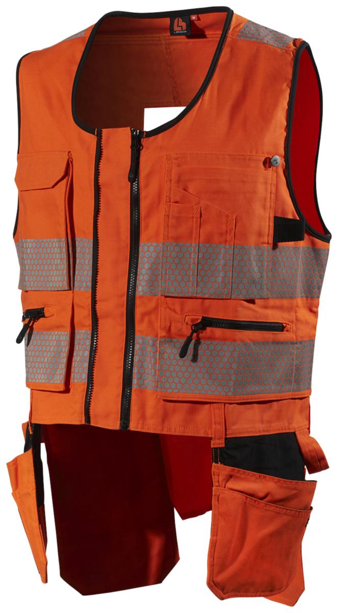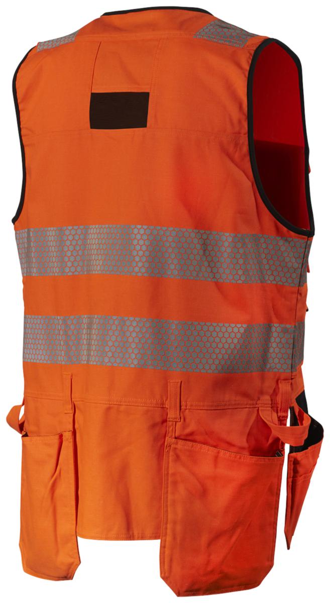 Työliivi huomiomateriaalia, riipputaskut on vahvistettu Corduralla. Vettä ja likaa hylkivä päämateriaali, jonka kulutuskestävyys on hyvä. Venyvä Canvas-kangas takaa hyvän käyttömukavuuden ja kulutuskestävyyden. Neljä riipputaskua on vahvistettu Corduralla. Täyspitkä vetoketju. Leveys säädettävissä lisävetoketjulla, jolloin liiviä voidaan käyttää paksumman takin päällä. Pidennetty selkäkappale. Aukko takana valjaille. Kaksi läpällistä rintataskua ja kaksi vetoketjullista sivutaskua. Piilotettu henkilökorttitasku oikealla puolella.