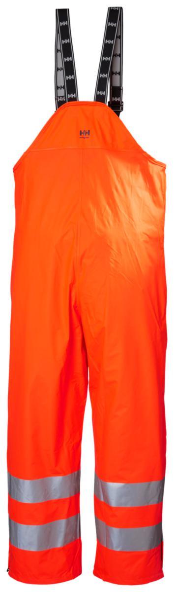 Huomiovaate EN ISO 20471, luokka 2/2. Vedenpitävyys EN 343, luokka 3/1. 100 % polyesteriä – 170 g/m², PU-pinnoite . Vedenpitävä kangas ja rakenne. Kaksi kangaskerrosta polvissa. Irrotettavat joustavat olkaimet. Läpällä varustetut vetoketjut lahkeissa.