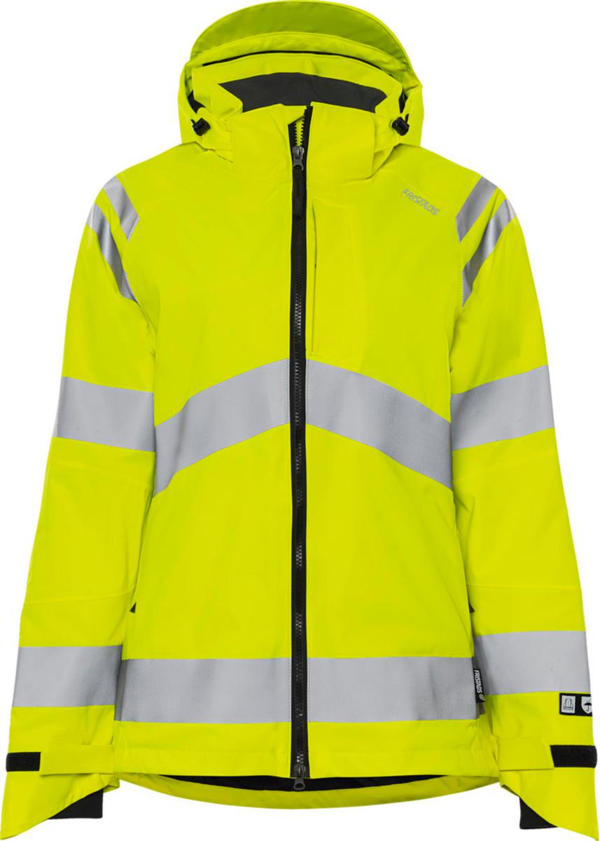 Näkyvä naisten kuoritakki pehmeästä ja joustavasta kierrätetystä materiaalista. Veden- ja tuulenpitävä, hengittävä työtakki teipatuilla saumoilla. Mukava vuoden ympäri käytettävä vaate, joka voidaan yhdistää eristävään välikerrokseen kylmällä säällä. Konsepti: Trofta
