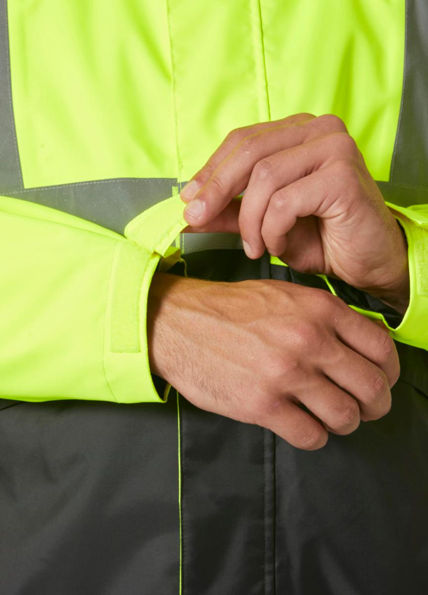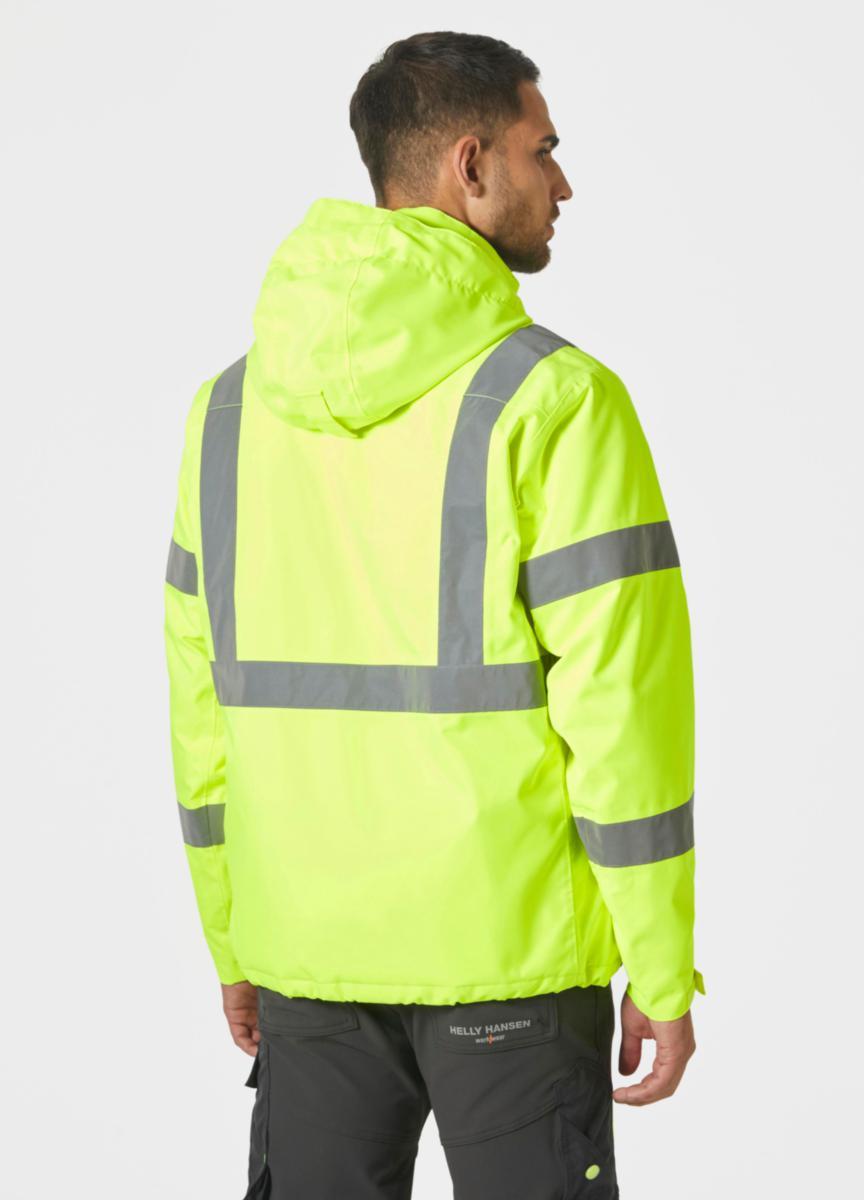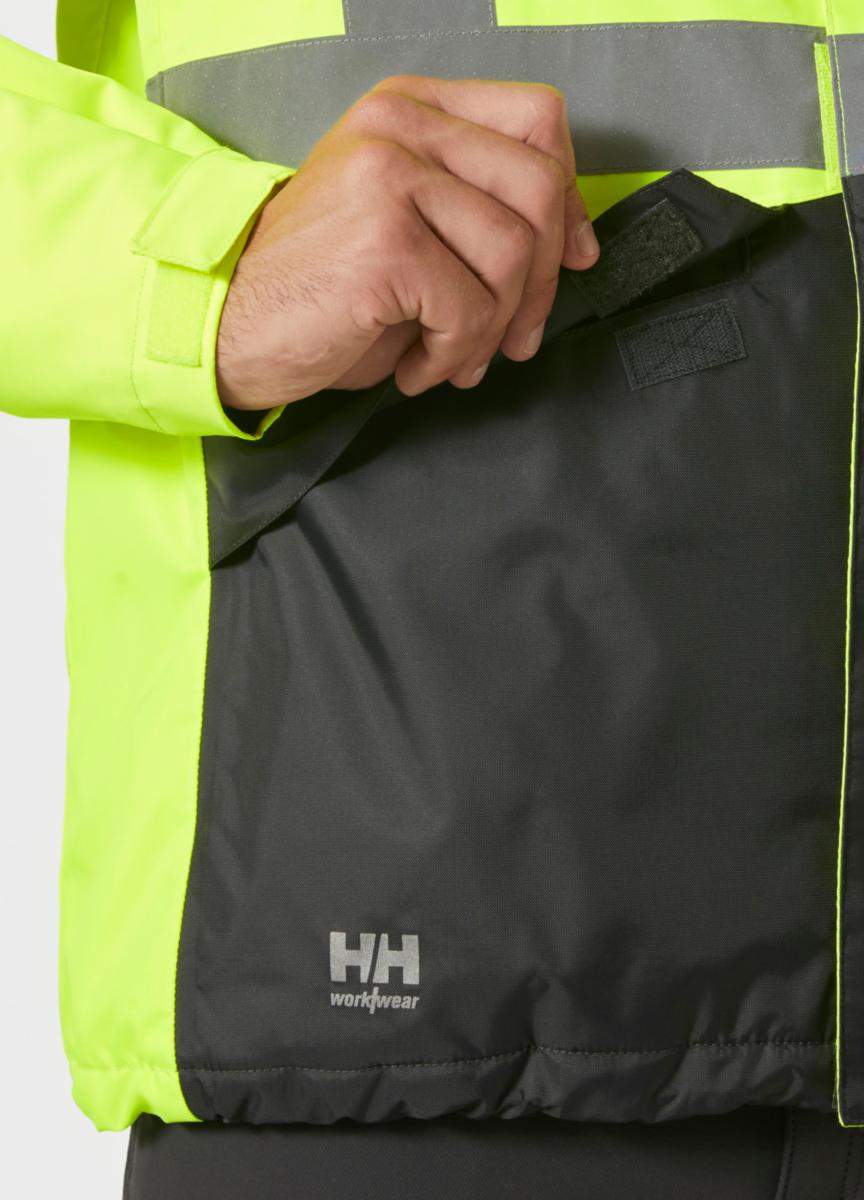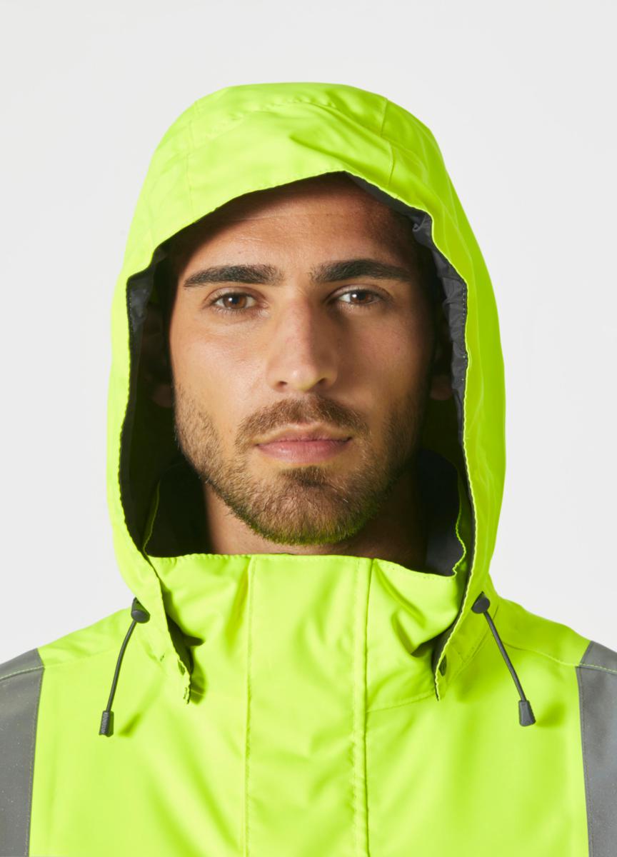 Edullinen huomiotalvitakki esimerkiksi rakennustöihin. Edessä YKK®-vetoketju. Kaksi läpällistä käsitaskua, joissa tarranauhasuljenta. Irrotettava huppu. Hupussa kiristysnyöri ja takana tarranauhasäätö. Tarranauhasäätö hihansuissa. Helmassa kiristysnyöri. Sisävuoren vetoketju helpottaa logon kiinnittämistä. Lenkki henkilökortille.
