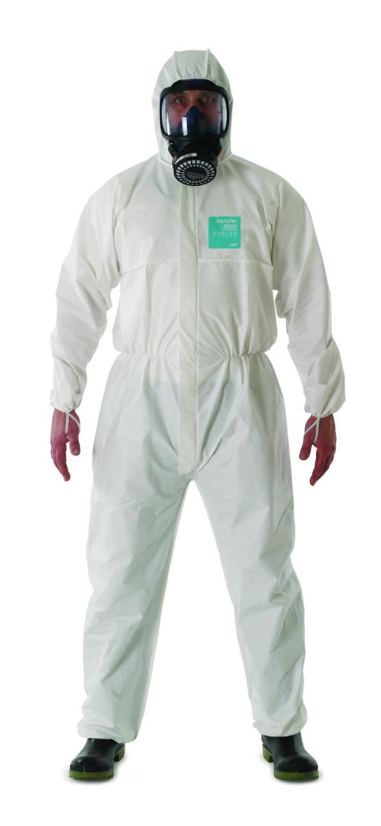 AlphaTec® 2000 STANDARD Bound - malli 111 antaa käyttäjälleen kohtalaisen kemiallisen suojan*, joka kestää nestemäisiä ja hiukkasmaisia biologisia vaaroja (mukaan lukien radioaktiiviset hiukkaset**). Tämä suojaava vartalopuku täyttää myös EN 14126 ja ASTM F1670/1671 -standardit veren välityksellä tarttuvien taudinaiheuttajien suojaamiseksi ja DIN 32781 -vaatimukset torjunta-aineiden kestävyyden osalta. Mikrohuokoisen polyeteenilaminaattilaminaattikuitukankaan käyttö tekee siitä vesihöyryä läpäisevän, mikä vähentää lämpöstressiä.