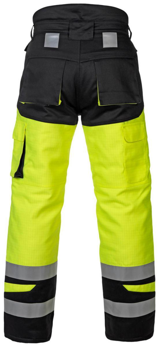 Palosuojatut antistaattiset ja näkyvät työhousut ammattilaiselle, joka työssään altistuu tulelle, kuumuudelle, kipinöille, valokaarille ja kemikaaliroiskeille. Käsitelty palosuoja-aineella.Takaa korotettu säädettävä vyötärö. Kaksi läpällistä sivutaskua, läpällinen reisitasku, kaksinkertainen mittatasku. Kaksi läpällistä takataskua ja polvisuojataskut. Riipputaskut tilataan erikseen.