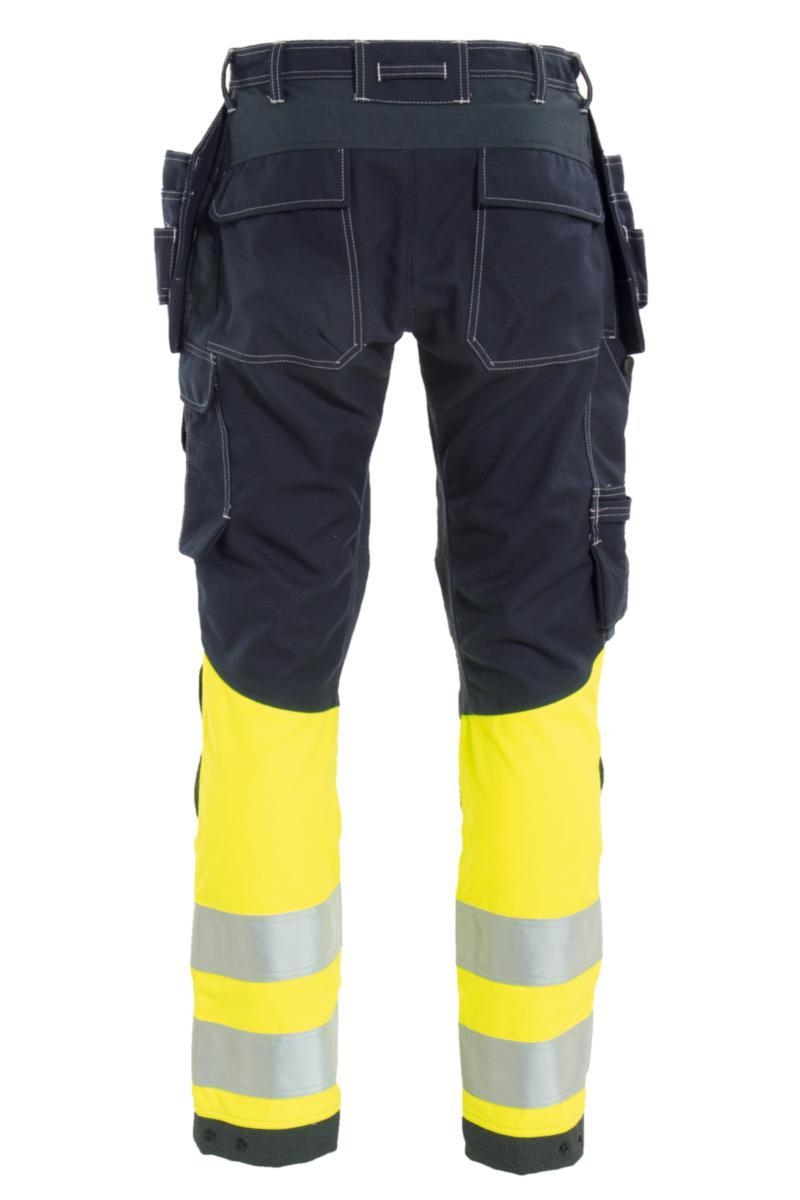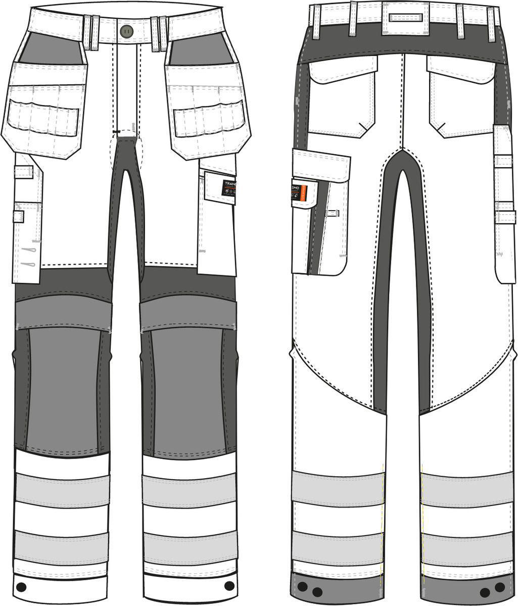 Vahvistettu sepalus ja haaroissa stretch-vyöhyke. HTFR Dobby -vahvistetut, työkalupidikkein varustetut riipputaskut. Sivutaskut. Stretch-vyöhykkeellä varustettu läpällinen reisitasku ja piilotettu D-rengas, läpällinen puhelintasku. Tuumamittatasku, jossa työkalulokero ja pidikkein varustettu puukkonappi. Muotoon ommellut polvet ja HTFR Dobby -polvisuojataskut sekä stretch-vyöhykkeet. Alaselässä stretch-vyöhyke. Läpälliset takataskut. Takana lahkeensuussa HTFR Dobbya. Painonapein säädettävä jalan leveys.