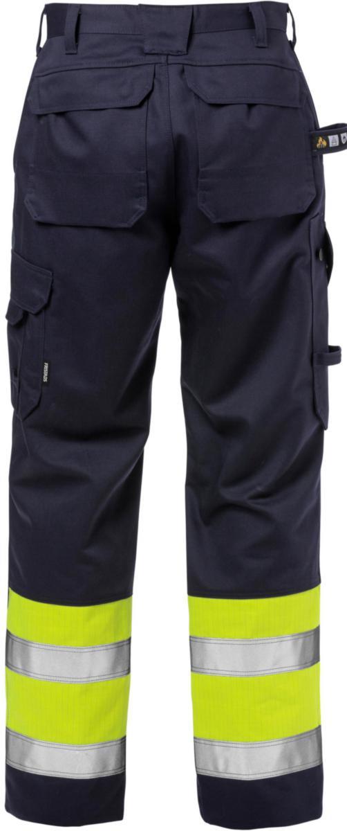 Kaksi etutaskua / Kaksi CORDURA®-vahvistettua takataskua, joissa läppä ja piilopainonappikiinnitys / Tuplavahvistettu haarasauma / Vasaralenkki / CORDURA®-vahvistettu taittomittatasku, jossa läppä ja painonappikiinnitys, sekä nappi ja lenkki puukolle / Reisitasku, jossa läppä ja piilopainonappikiinnitys, puhelintasku, jossa läppä ja tarrakiinnitys, D-rengas ja henkilökorttitasku / Sisäpuolelle avautuvat CORDURA®-vahvistetut polvitaskut / Polvitaskuissa polvisuojien korkeudensäätö / Aramidi-vahvistetut reisipaneelit / CORDURA®-vahvistetut lahkeensuut / Standardien EN 61482-1-2 luokka 1, EN 61482-1-1 ATPV 10,6 cal/cm² HAF 80,4% (katso valokaaritaulukosta standardin EN 61482-1-2 luokka 2 mukaan sertifioidut vaateyhdistelmät ja open arc -sertifioidut vaatteet standardin EN 61482-1-1 mukaisesti), EN ISO 11612 A1 B1 C1 E2 F1, EN ISO 11611 A1 luokka 1, EN 1149-5, EN ISO 20471 luokan 1 mukainen ja EN 14404 yhdessä polvisuojien 124292 kanssa / Testattu teollisen pesustandardin ISO 15797 mukaisesti / ÖKO-TEX® -sertifioitu.