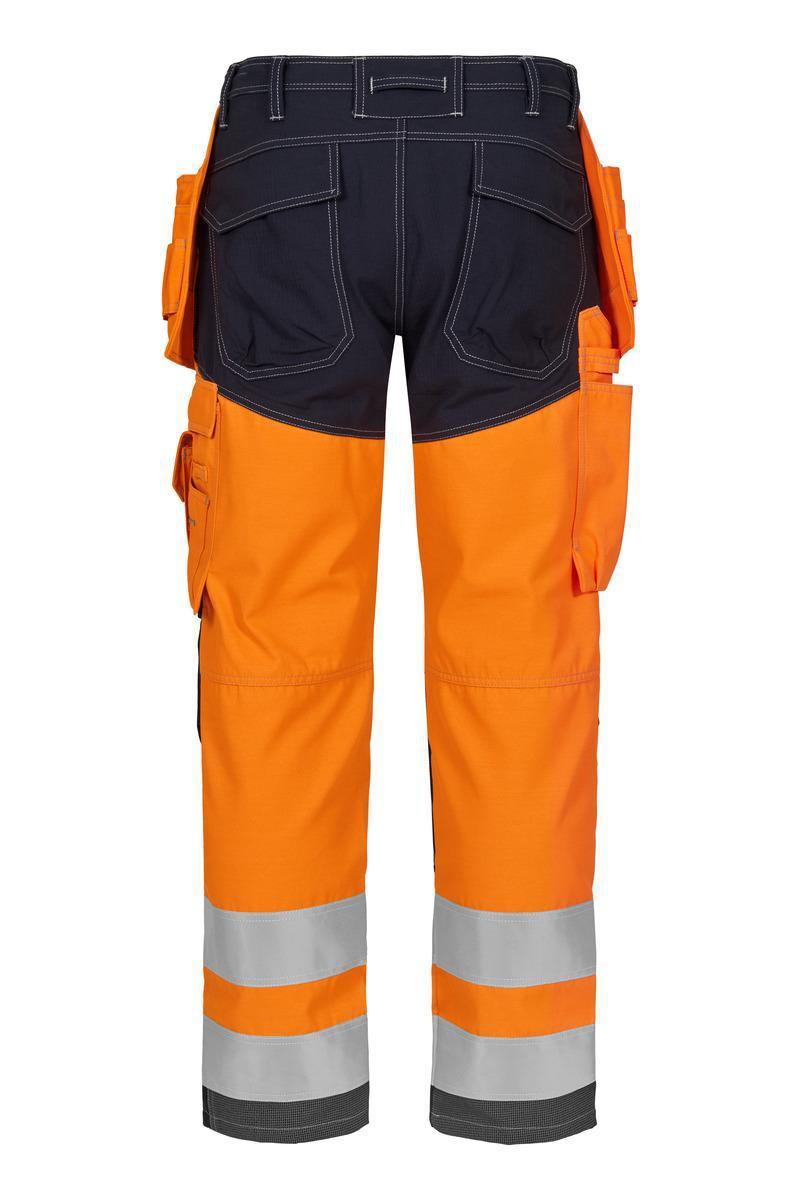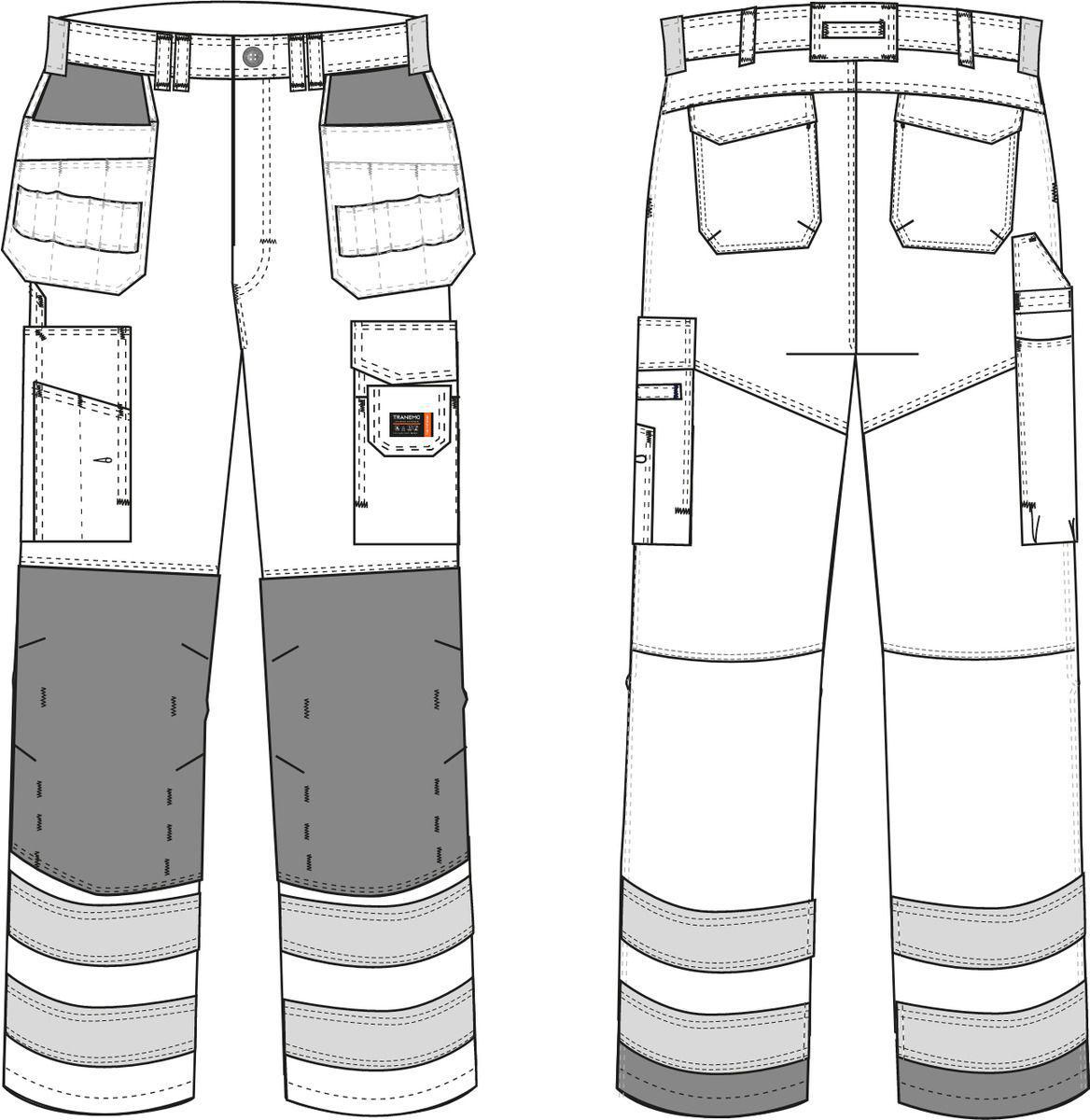 Mukavasta, kestävästä ja hyvin väripitävästä kankaasta valmistetut riipputaskulliset, metallivapaat ja sisäisesti palosuojatut huomiohousut. Työkalulenkit vyötäröllä. Sivutaskut. HTFR Dobby -vahvistetut, työkalupidikkein varustetut riipputaskut. Läpälliset takataskut. Vasemmassa reisitaskussa on läppä ja puhelintasku. Oikeanpuoleisessa reisitaskussa on työkalulokero ja tuumamittatasku. HTFR-Dobby vahvistetut ja muotoon ommellut polvet, sisäisesti säädettävä polvisuojataskut. Takana HTFR Dobbylla vahvistetut lahkeensuut.