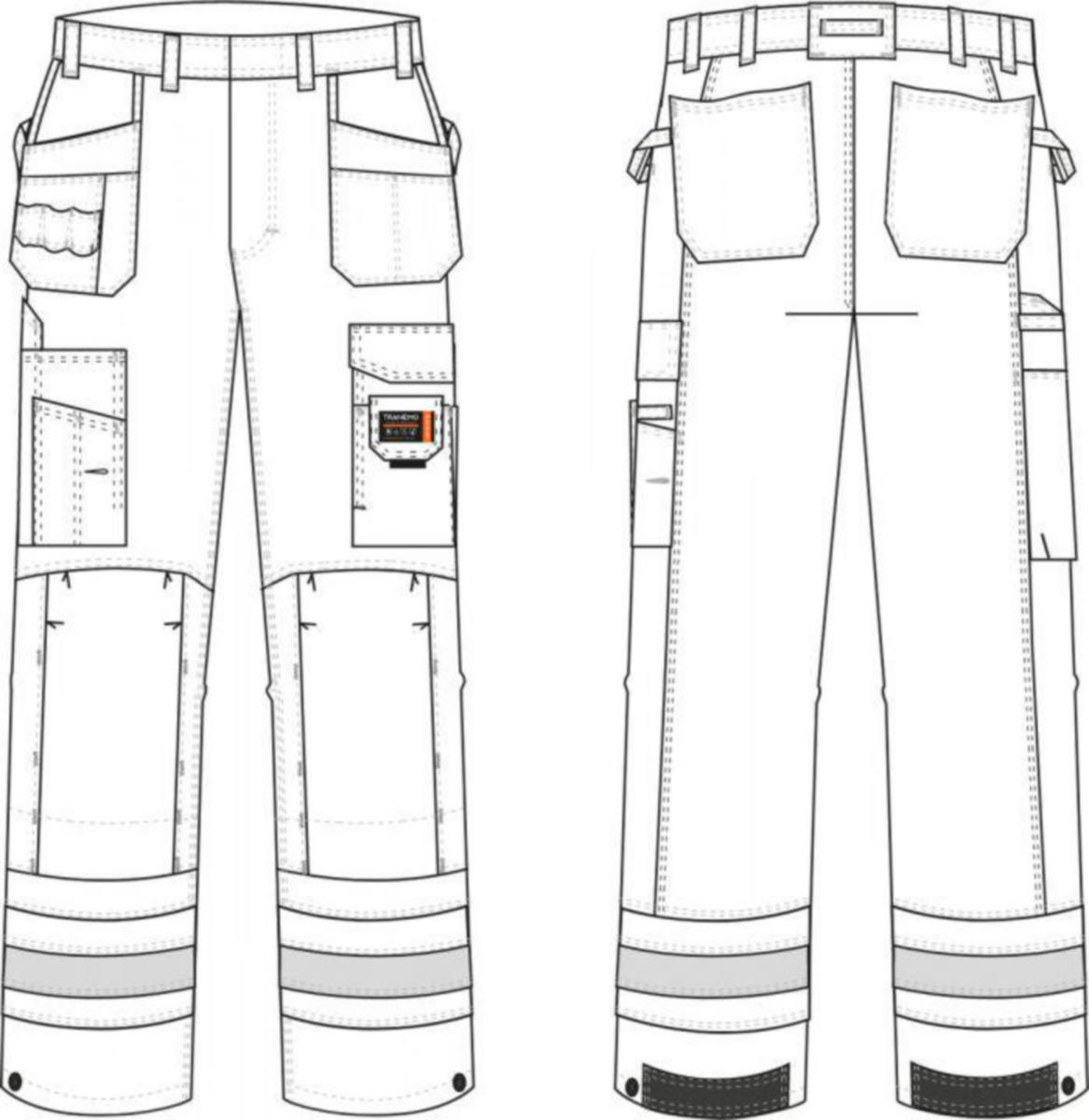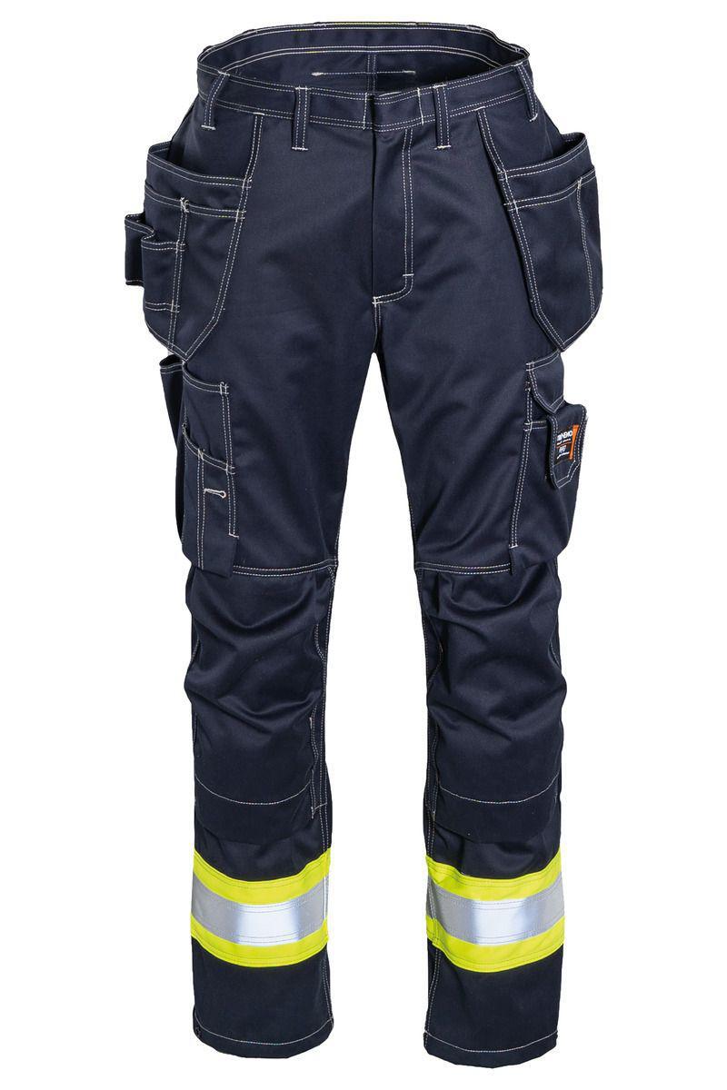 PFAS-vapaat sisäisesti palosuojatut riipputaskuhousut korostetulla näkyvyydellä, etuosassa Cantex Weld, takana Cantex Strech. Cantex Stretch takaa hyvän istuvuuden ja antaa lisämukavuutta täydellistä liikkuvuutta vaativissa töissä. Tupla riipputaskut työkalupidikkein. Sivutaskut. Takataskut. Vasaralenkit. Vasen reisitasku läpällinen, puhelintasku ja piilotettu D-rangas. Oikeassa reisitaskussa lisä työkalutasku, tuumamittatasku lenkillä ja piilotetulla puukkonapilla. Polvisuojataskut, joissa kaksi säätömahdollisuutta. Säädettävät lahkeensuut painonapeilla ja HTFR Dobby vahvistetut takalahkeensuut. Kontrastisaumat.