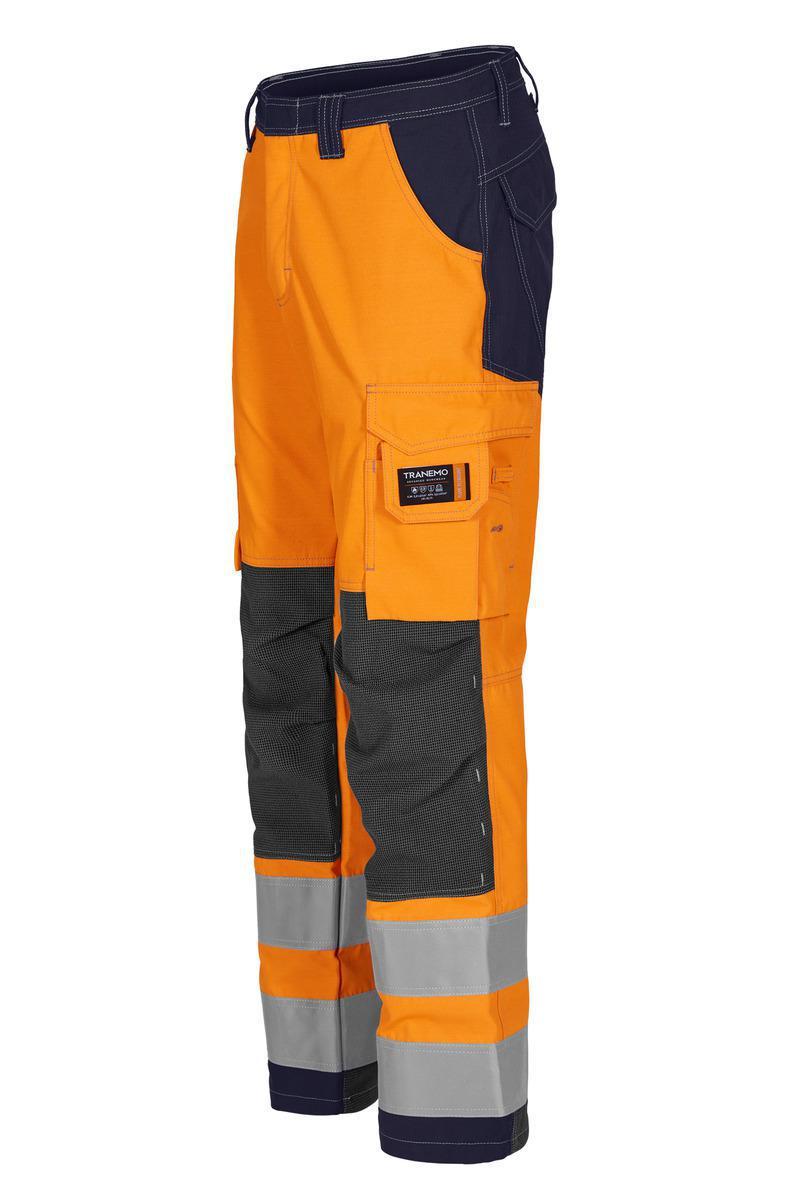 Mukavasta, kestävästä ja hyvin väripitävästä kankaasta valmistetut metallivapaat ja sisäisesti palosuojatut huomiohousut. Sivutaskut. Läpälliset takataskut. Vasemmassa reisitaskussa on läppä ja puhelintasku. Oikeanpuoleisessa reisitaskussa on työkalulokero ja tuumamittatasku. HTPA-vahvistetut ja muotoon ommellut polvet, sisäisesti säädettävä polvisuojataskut. Takana HTFR Dobbylla vahvistetut lahkeensuut. *EN ISO 20471 luokka 2