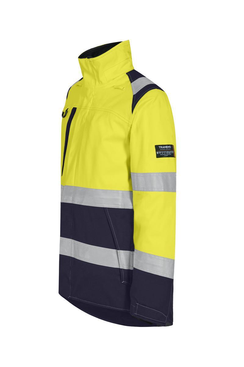Piilotettu vetoketju ja painonapit edessä. Kaksi lenkkiä kommunikaatiolaitteille. Vetoketjullinen pystysuuntainen rintatasku oikealla sekä D-rengas. Läpälliset lämpötaskut. Pidennetty selkäosa kahdella vetoketjuhalkiolla paremman liikkuvuuden takaamiseksi. Hihansuissa säätö ja suojattu resori. Kaksi povitaskua, joista toinen asiakirjoille. Kauluksessa fleeceä. Vuoressa vetoketju selkäpainatusta varten. Voidaan varustaa 905193 hupulla. *Vaate on testattu 3-kerrosjärjestelmänä yhdessä standardi alusvaatteiden kanssa. Tranemo suosittelee alusvaatteita 5920/5940 ja 5980.