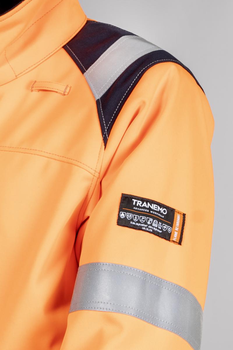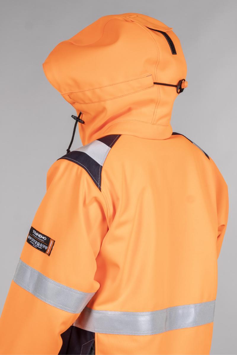 Metallivapaa sisäisesti palosuojattu, huomiotalvitakki, teipatut saumat ja tikkivuori. Tuulen- ja vedenpitävä EN 343 mukaan. Piilotettu vetoketju ja painonapit edessä. Kaksi lenkkiä kommunikaatiolaitteille. Vetoketjullinen pystysuuntainen rintatasku oikealla sekä D-rengas. Fleecevuoratut läpälliset sivutaskut. Pidennetty selkäosa kahdella vetoketjuhalkiolla paremman liikkuvuuden takaamiseksi. Hihansuissa säätö ja suojattu resori. Povitasku tabletille/asiakirjoille. Kauluksessa fleeceä. Vuoressa vetoketju selkäpainatusta varten. Voidaan varustaa 9151 82 hupulla. *Takki on yhdistelmäsertifioitu ja saavuttaa EN ISO 20471 lk.3 yhdessä Tranemon housujen tai avosuojan kanssa, jotka on sertifioitu EN ISO 20471 lk.1 tai lk.2 mukaan. **Vaate on testattu 3-kerrosjärjestelmänä yhdessä standardi alusvaatteiden kanssa. Tranemo suosittelee alusvaatteita 5920/5940 ja 5980.