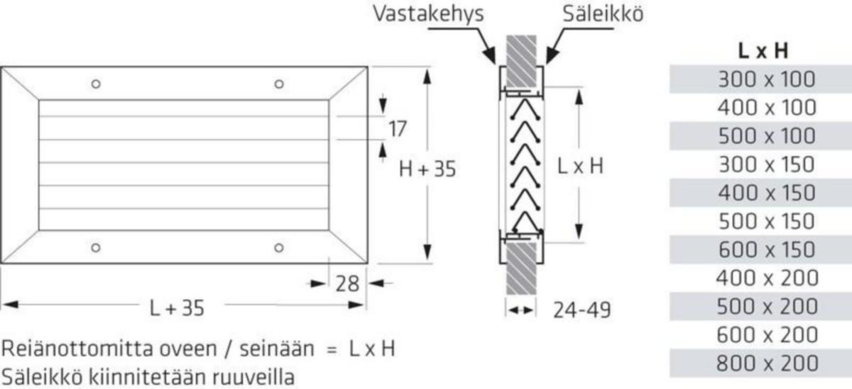 KIO on muotoilultaan huomaamaton siirtoilmasäleikkö oveen tai väliseinään. Säleikön asennussyvyys on säädettävissä 30-50 mm rakenteen vahvuuden mukaan.