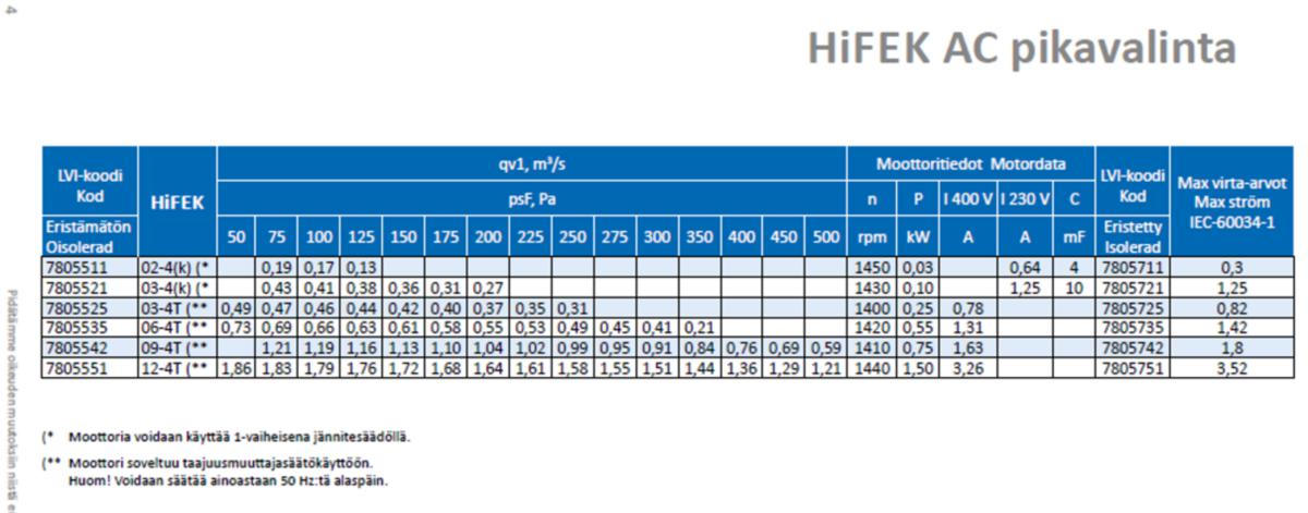 Huippuimurien teho vaihtelee 0.25 kW ja 1.5 kW välillä.