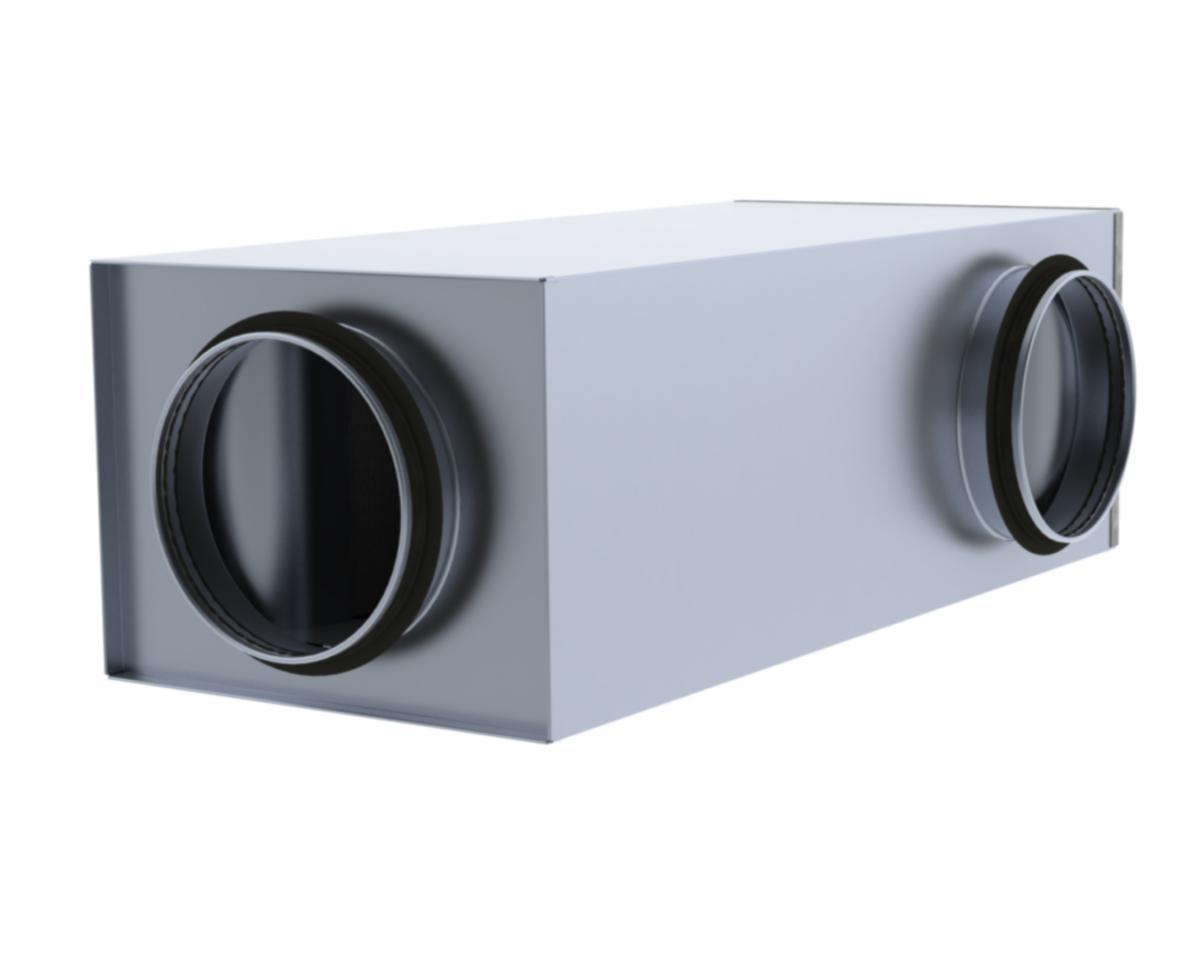 Matala ja suorakaiteenmuotoinen pyöreillä kanavaliitoksilla oleva kulmaäänenvaimennin ilman rei´itettyä sisäputkea. Vaimennin on tarkoitettu ilmanvaihtojärjestelmän pyöreiden kanavien äänenvaimentimeksi, joissa tarvitaan kanavaliitos vaimentimen sivulta.