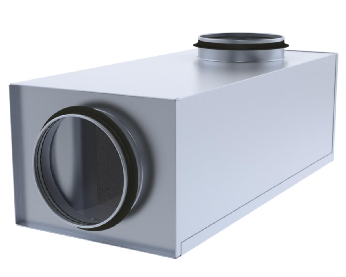 Matala ja suorakaiteenmuotoinen pyöreillä kanavaliitoksilla oleva kulmaäänenvaimennin ilman rei´itettyä sisäputkea. Vaimennin on tarkoitettu ilmanvaihtojärjestelmän pyöreiden kanavien äänenvaimentimeksi, joissa tarvitaan kanavaliitos vaimentimen päältä.