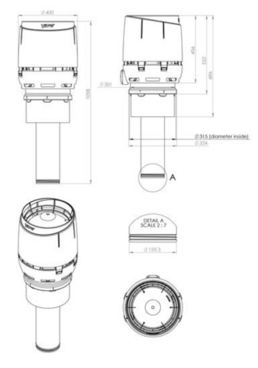 Käyttökohteet: Ilmanvaihdon eristetty poistoputki, jossa FLOW-hattu. Sisäputki, jossa huulitiiviste, sinkittyä teräsohutlevyä. Asennetaan peltisepän tekemään kartioon, jonka yläosa Ø 315 mm.