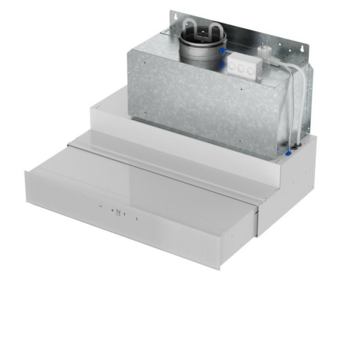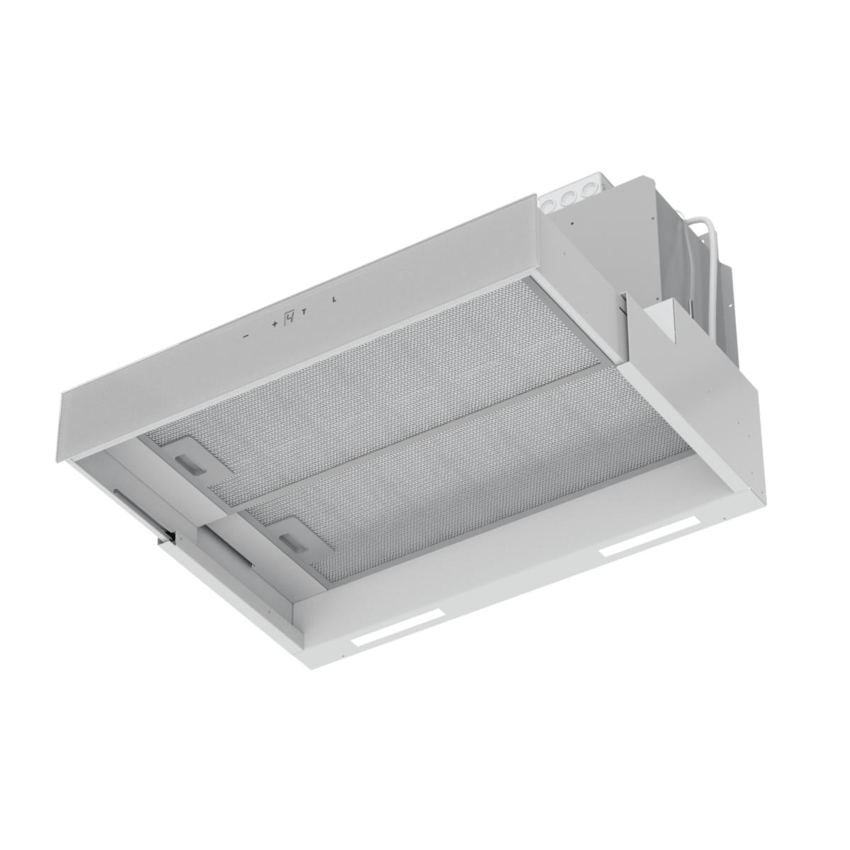 Suvi-CF55w, Leveys 498mm. Runko valkoinen, Etulista lasi: valkoinen taustapainatus, Kerrostalokupu omalla palonrajoittimella ja ääneneristysyksiköllä. Kaapistoon integroitava, Liukuversio, Kytkimet: Kapasitiiviset kytkimet integroitu etupaneeliin, Led-va