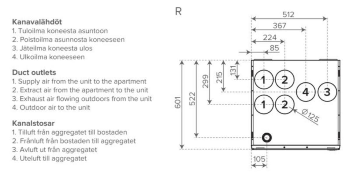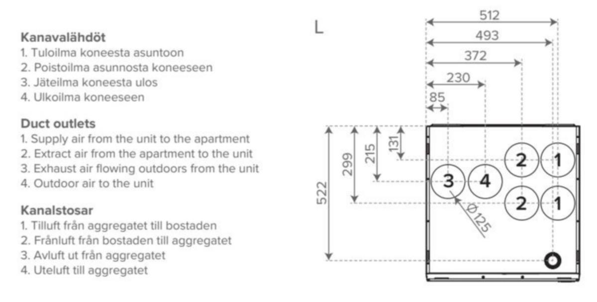 - Sopii suoraan MUH Ilmava 100/120 L- ja Vallox 121 MC/SE L-kätisten koneiden kanavistolähtöihin