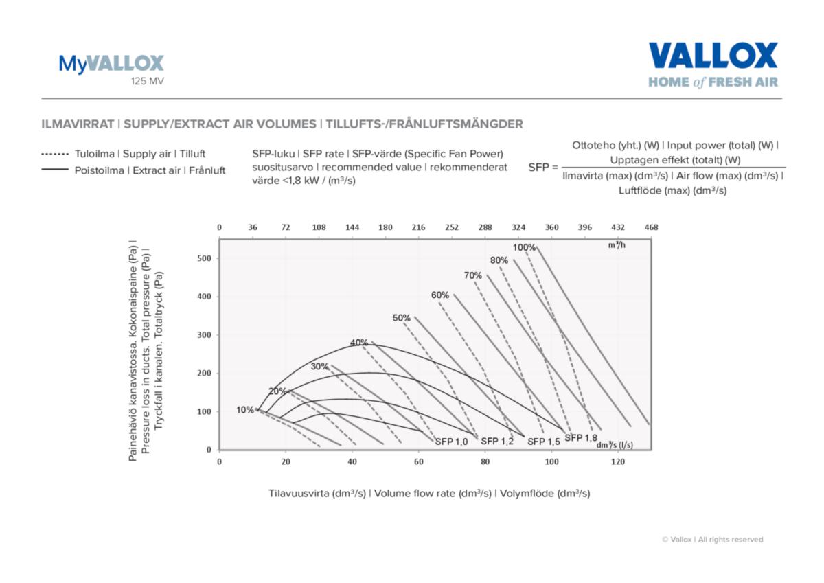 - Tehonkulutus suurimmalla ilmamäärällä 100 Pa:ssa: 0.34 kW