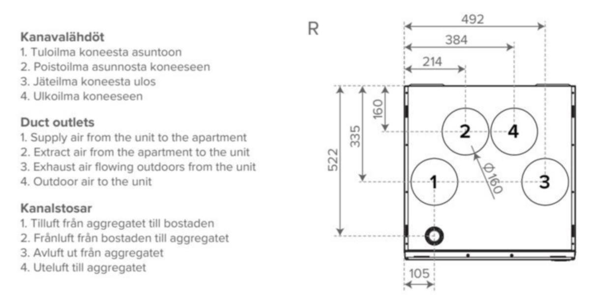 - Enimmäisilmamäärä, 50 Pa: 281 m³/h