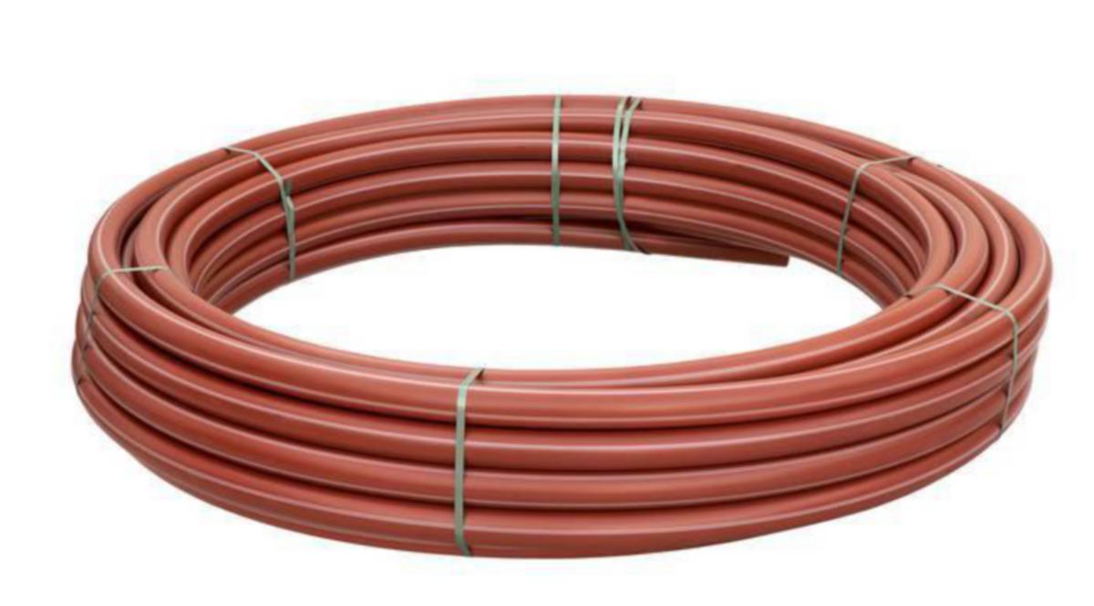 ProFuse RC -paineviemäri SDR17, EN 12201, PE 100. Putkessa on ruskea suojakuori, jossa on valkoiset raidat. Putkella on Nordic PolyMark -hyväksyntä.