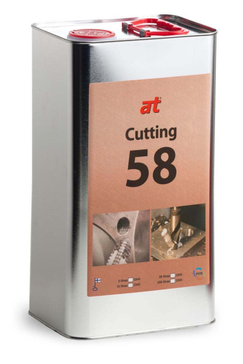 Cutting 58 on veteen sekoittuva mineraaliöljypohjainen metallintyöstöneste, joka muodostaa pysyvän emulsion. Nesteellä on hyvät EP ominaisuudet ja se tarjoaa suojan sekä sieni- että bakteerikasvustoja vastaan. AT Cutting 58 on sopiva metallien yleistyöstöön, esimerkiksi teräksien, alumiinin ja messingin sorvaamiseen, poraamiseen ja sahaamiseen sekä teräksen ja valuraudan hiomiseen. Paras lopputulos saadaan seuraavilla aine/vesi seossuhteilla : yleistyöstö 5 – 10 %, hiominen, teräs 2,5 – 3 % hiominen, valurauta 4 – 5 %. Tyypilliset ominaisuudet: Tiheys kg/m³, 15°C 913, Viskositeetti cSt/40°C 22 pH ( 10 % liuos) 9.6, Korroosionkesto DIN51360,P2, >8% 0 – 0, Refraktiokerroin 1.04, Säilytys : +5° – – +40°C