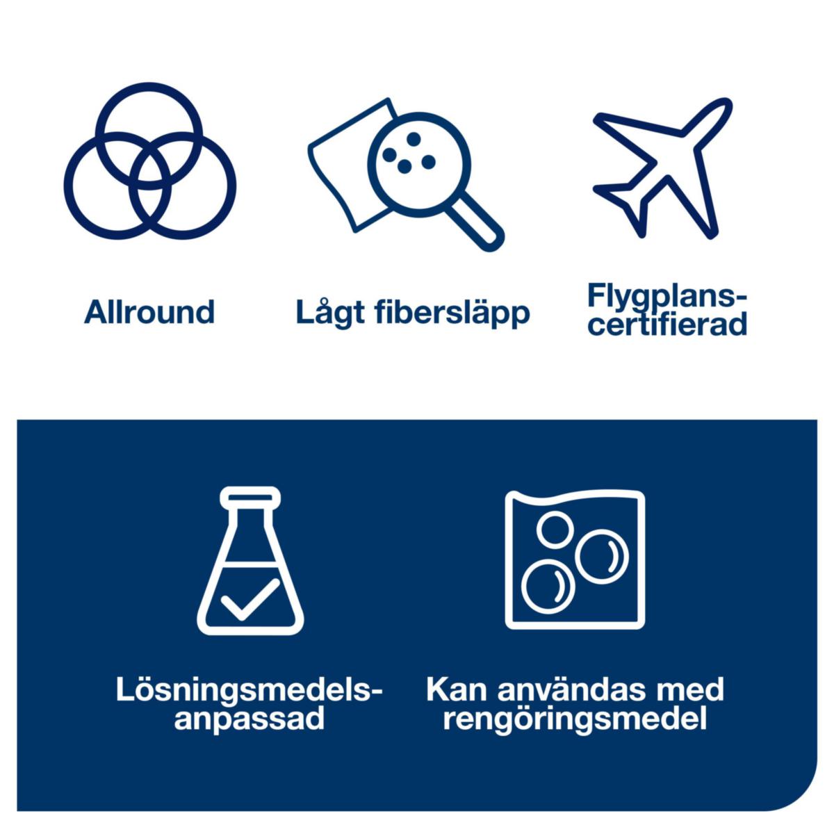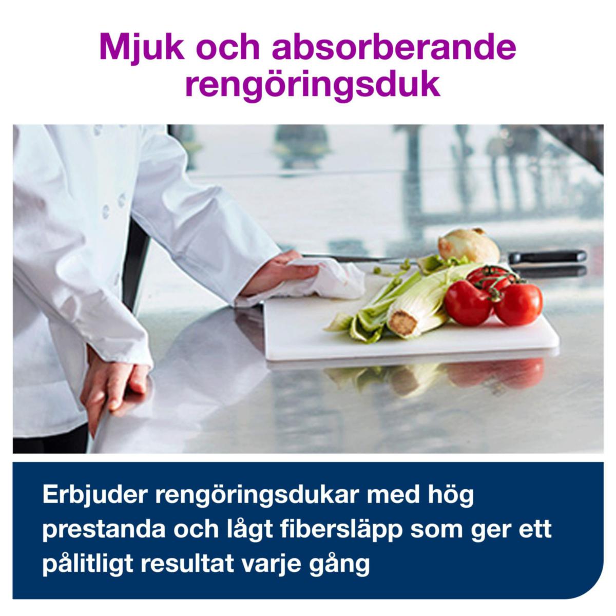 Tork Cleaning Cloth Durable on erittäin imukykyinen ja kestävä, joten sitä voidaan käyttää toistuvasti repeytymättä. Puhdistusliina sopii Tork Dispenserin taitettuihin liinoja yläpakkaukseen, joka suojaa liinoja lialta ja vähentää kulutusta ja hävikkiä syöttämällä yksi liina kerrallaan. Voidaan käyttää useimpien liuottimien desinfiointi- ja puhdistusaineiden kanssa. Täydellinen herkkien pintojen puhdistukseen äärimmäisen vähäisen kuitupäästönsä ja antistaattisten ominaisuuksiensa ansiosta. Monipuolinen puhdistusliina, joka vähentää useiden erityyppisten puhdistusliinojen tarvetta.