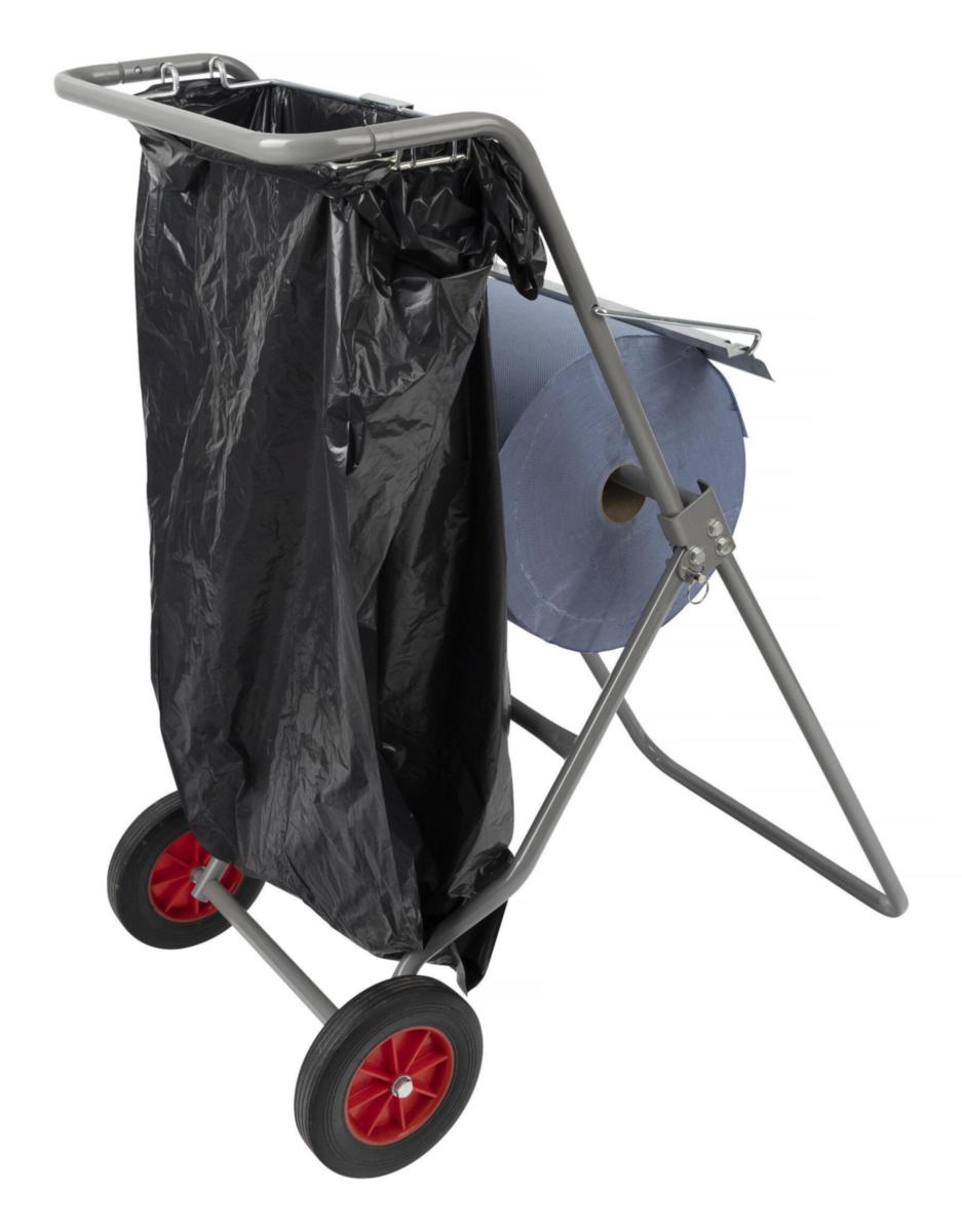 Yhdistetty lattiateline paperipyyhkeille ja jätesäkille. Punaiseksi maalattua terästä. Paperipyyherullille maks. 400 mm.