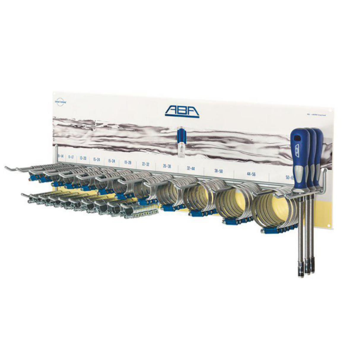 Seinäteline jossa on letkusiteet 8-65mm välille, miniletkusiteet 7-17,5mm välille sekä yksi letkunkiristinmeisseli