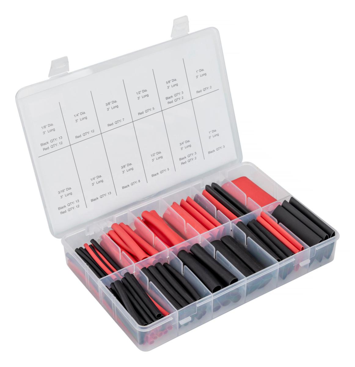 Sisältö: 25 x Ø1/8" (3,2 mm), 25 x Ø3/16" (4,8 mm), 25 x Ø1/4" (6,4 mm), 15 x Ø3/8" (9,5 mm), 10 x Ø1/2" (12,7 mm), 5 x Ø5/8" (15,9 mm), 5 x Ø3/4" (19 mm) ja 5 x Ø1" (25,4 mm). Sisältää yhteensä 115 kutistusletkua.