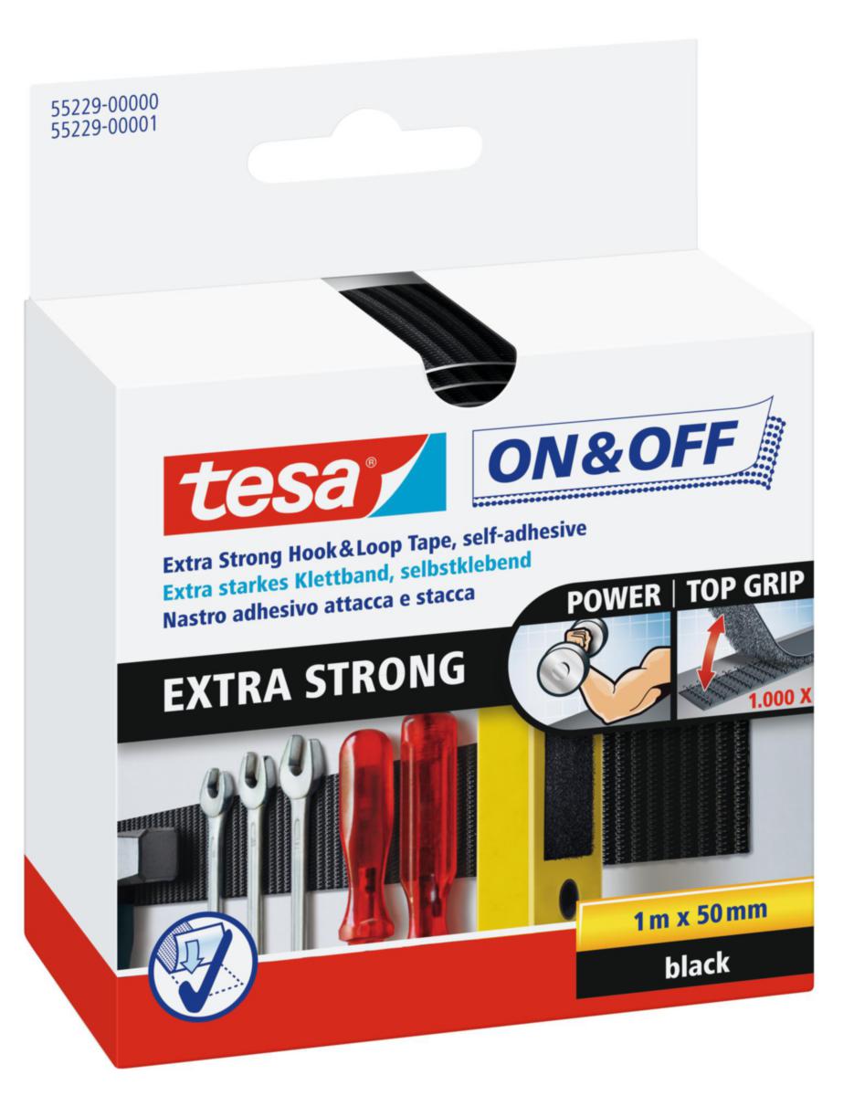 tesa® On & Off Erittäin kestävä tarranauha on suurta kuormitusta kestävä tarranauha erityisesti raskaiden esineiden kiinnittämiseen. Yleiskäyttöinen itsekiinnittyvä tarranauha soveltuu raskaiden esineiden, kuten työkalujen, toimistotarvikkeiden, keittiövälineiden ja kotitaloustarvikkeiden kiinnittämiseen. Liimaa pala monikäyttöistä tarranauhaa seinään, tikkaisiin tai muuhun tasaiseen pintaan. Kiinnitä vastakappale työkaluun tai tarvikkeeseen – valmis. Älykäs ratkaisu esineiden kiinnittämiseen siten, että ne ovat käsillä aina tarvittaessa.