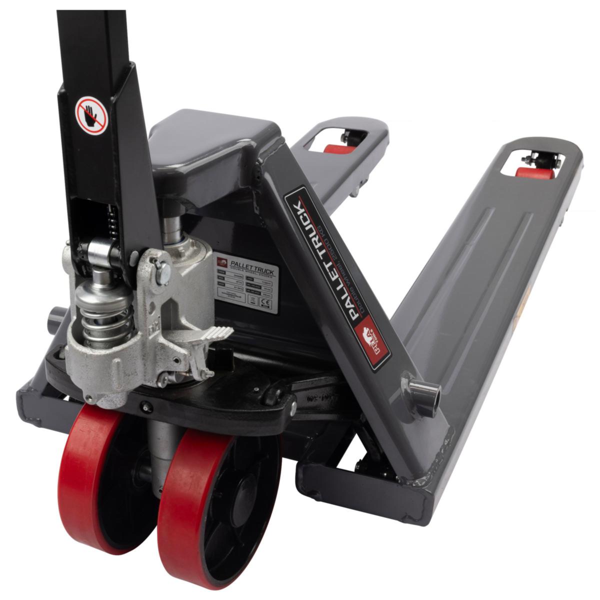 Kestävä haarukkavaunumme on suunniteltu kestämään kovia työolosuhteita ja tarjoamaan luotettavaa suorituskykyä. Se tarjoaa normaalin nostokapasiteetin ja on varustettu sisäänrakennetulla ylikuormitusventtiilillä joka lisää turvallisuutta. Tämä haarukkavaunu on kestävä, hiljainen ja helposti ohjattava rasvanippojen, alumiinipyörien ja PUR-telojen ansiosta. Siinä on suljettu hydraulijärjestelmä suojatulla pumpulla ja täysin valetulla pumpun pesällä, mikä lisää kestävyyttä ja pitkäaikaista käyttöä.