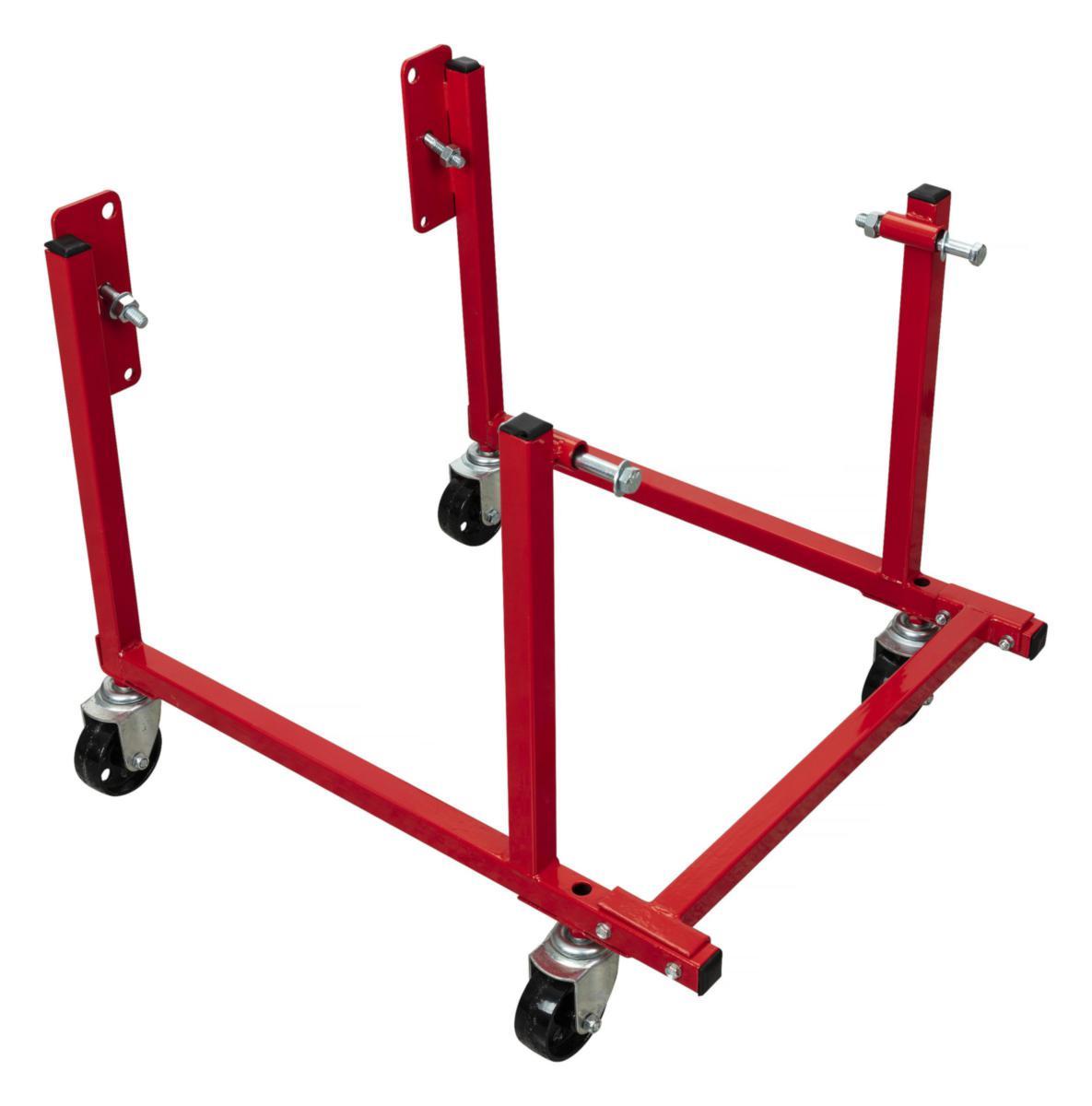 Moottorivaunu Mopar-pikkulohkomoottoreille, täydellinen moottorin korjaukseen tai säilytykseen. Teräsvaunu on jauhemaalattu punaiseksi ja varustettu 4 kääntyvällä pyörällä.