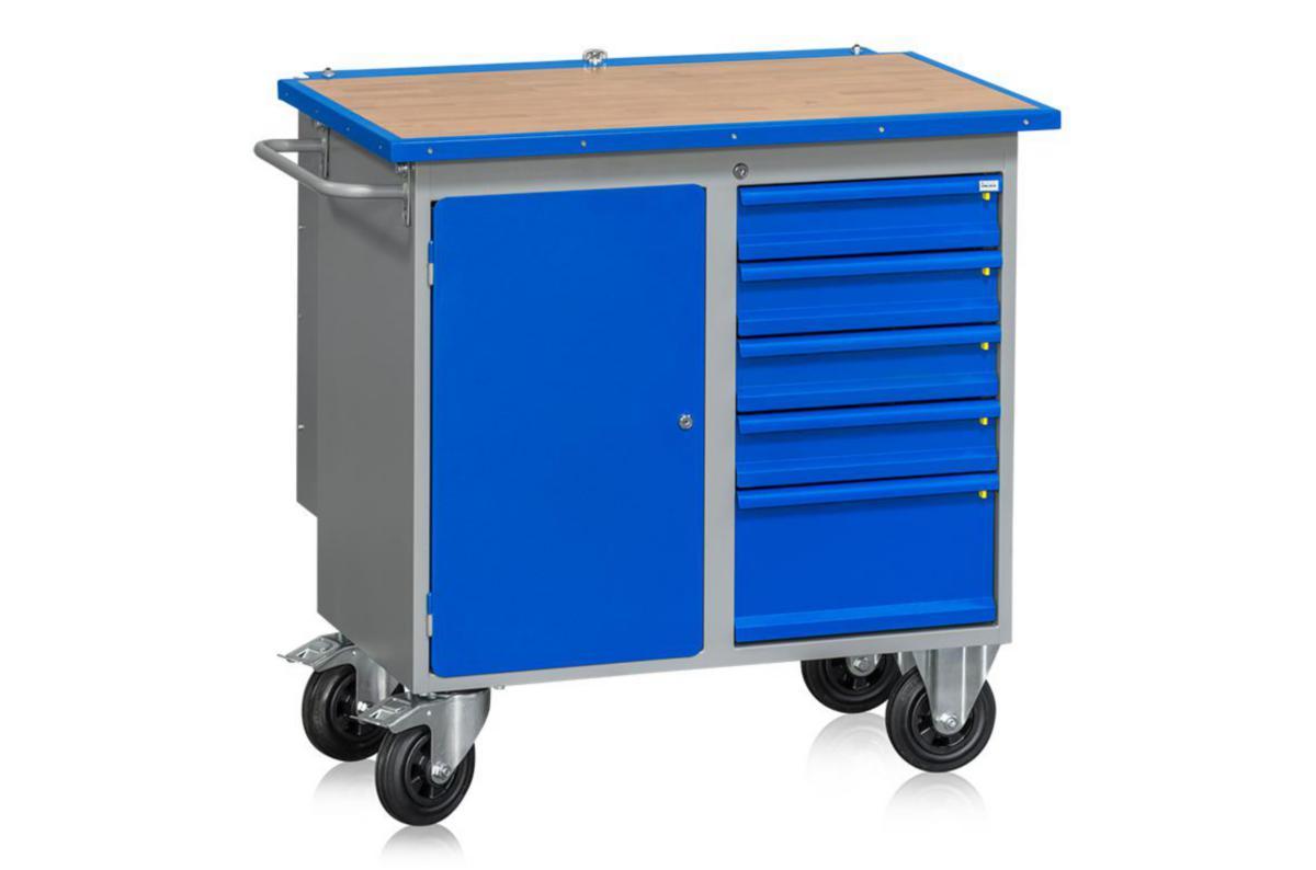 Siirrettävä työpöytä 5 laatikolla. Valmistettu teräslevystä, työtaso tammiparkettia (950x600 mm), varustettu kahdella kiinteällä ja kahdella lukittavalla pyörällä, halkaisija 160 mm. 4 x 100 mm laatikkoa ja 1 x 200 mm laatikko. Runko pulverimaalattu harmaa RAL 7037, muu sininen RAL 5005. Ovi ja kaikki laatikot ovat lukittavia. Kaapissa on irrotettava hylly. Laatikoihin mahtuu Arca-muovilaatikoita, joiden pituus on 400 mm, 3 kpl 115 mm vaihtoehtoisesti 115 mm plus ja 230 mm.