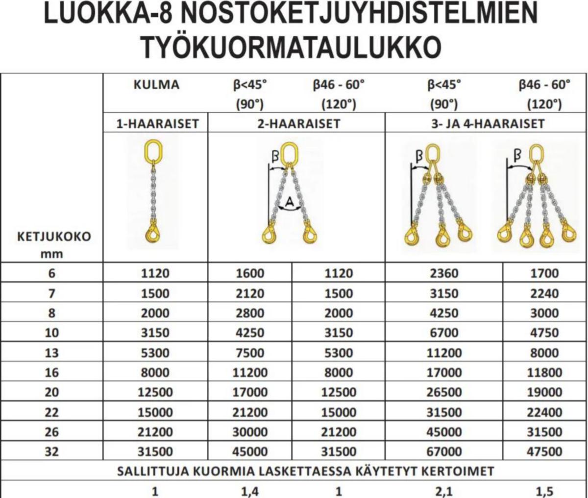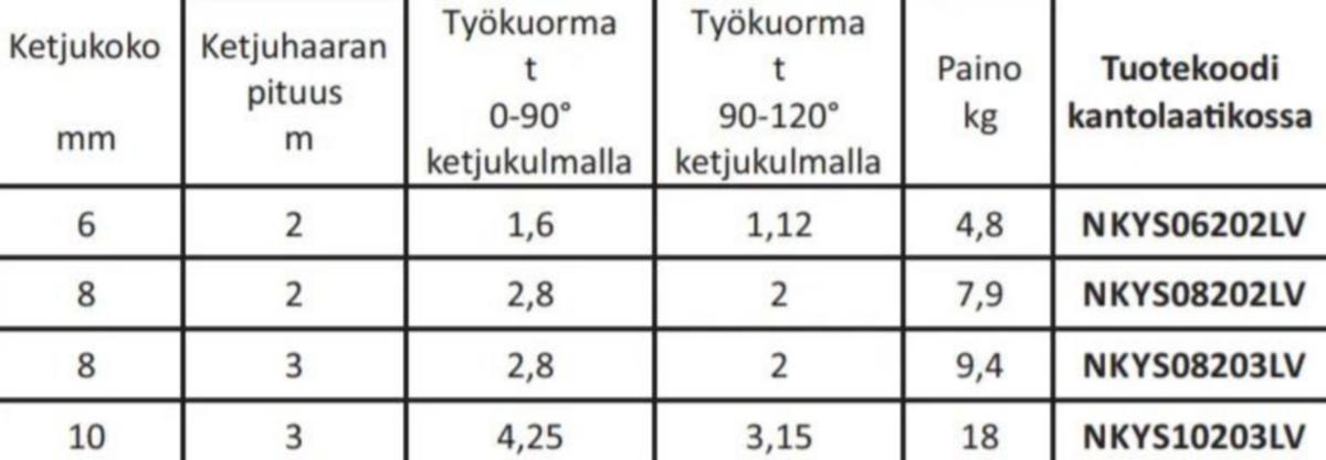 Hyötypituus: 2 m. Varmuuskerroin: 4:1.