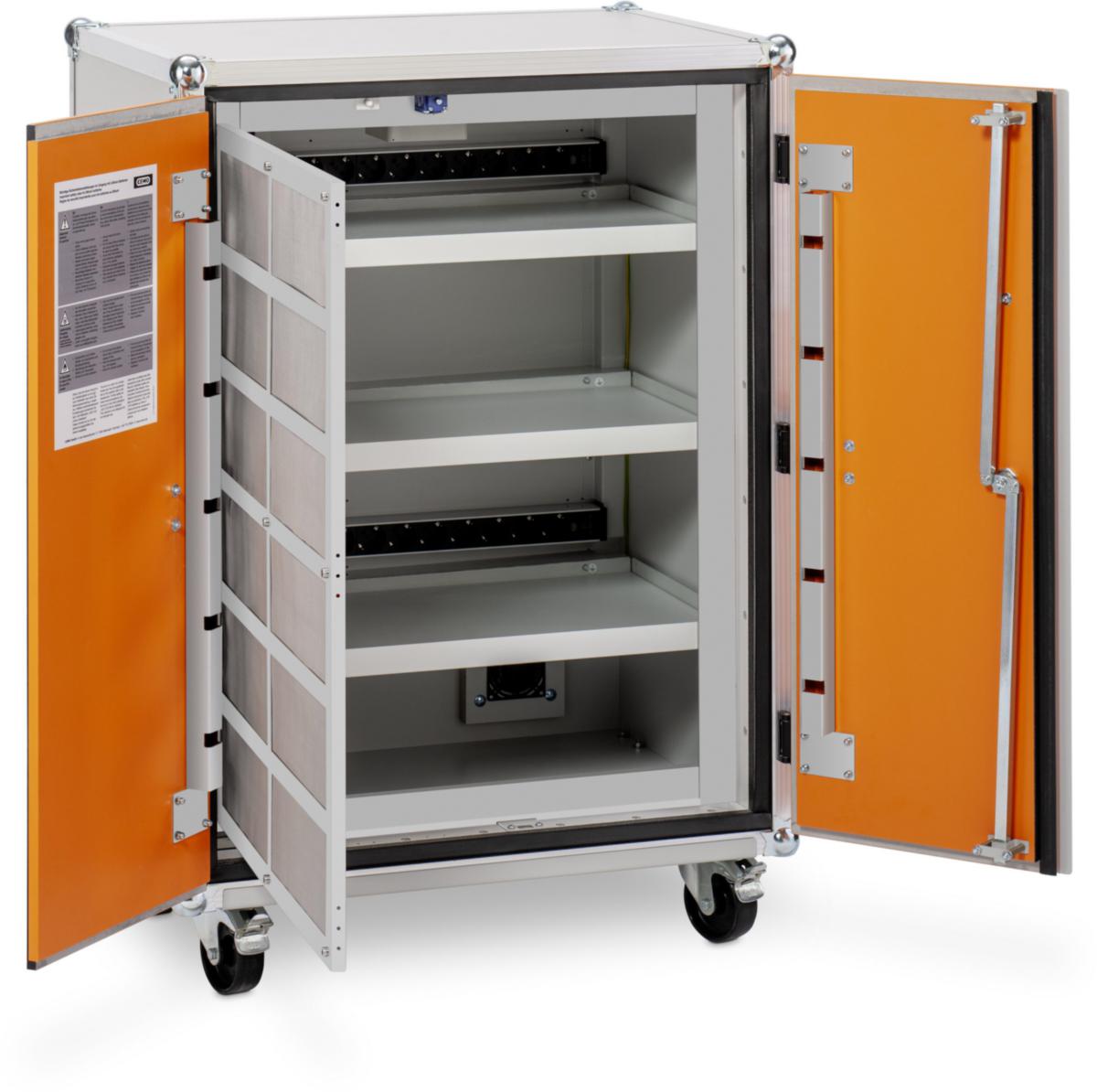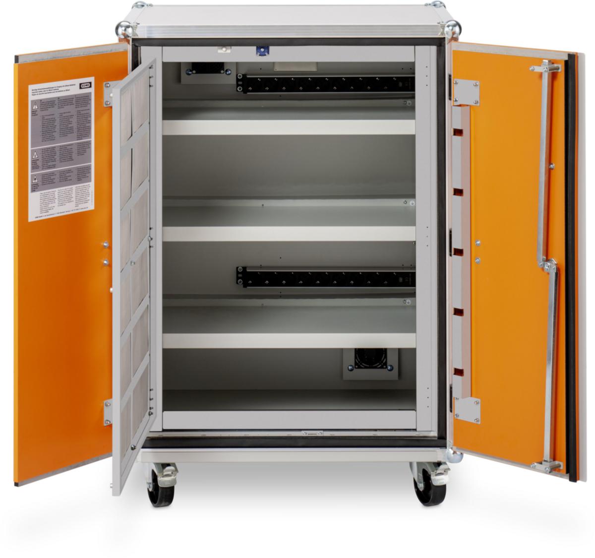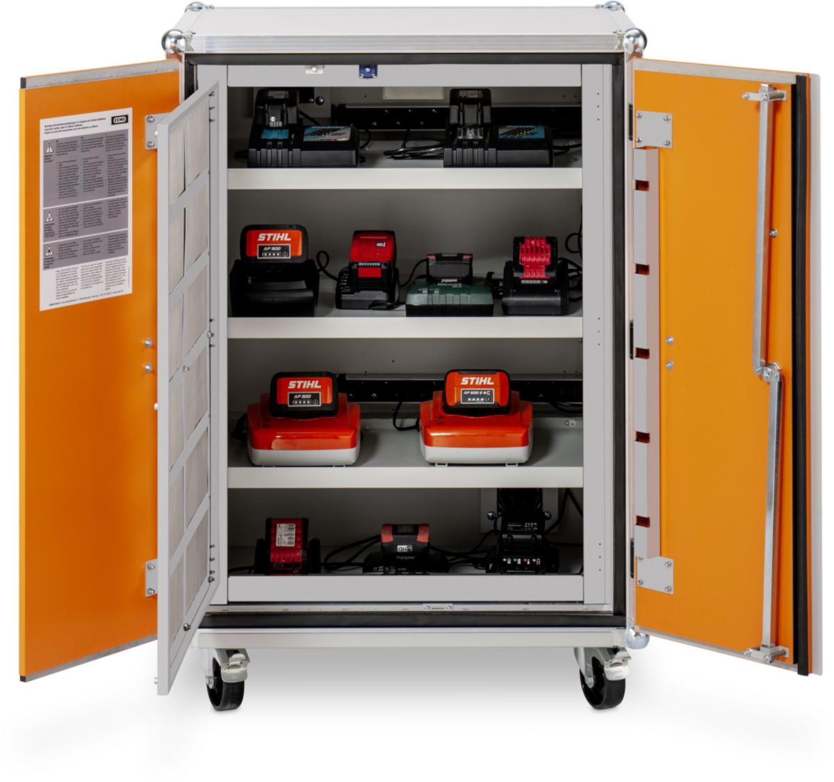 Akkulatauskaappi 8/10, 230 V, pyörillä. Sähkö syötetään kahdesta vaakasuunnassa sijoitetusta 9:n pistokkeen jatkopistorasiasta. Jopa neljä säilytystasoa. Maksimikapasiteetti: 6 kWh.
