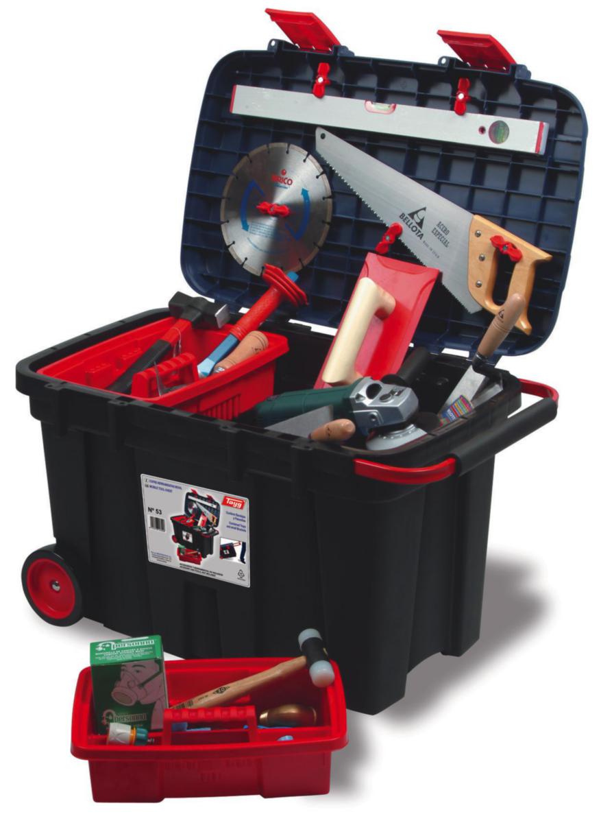 Pakki on tilava ja vakaa, ja siinä on kaksi pyörää ja ulosvedettävä teräksinen veto- ja nostokahva. Toimii myös työalustana ja jakkarana. Jousilukko ja paikka riippulukolle. Pidike kannen sisäpuolella työkaluille ja kaksi työkalukaukaloa eniten käytetyille työkaluille. Ei sisällä työkaluja.