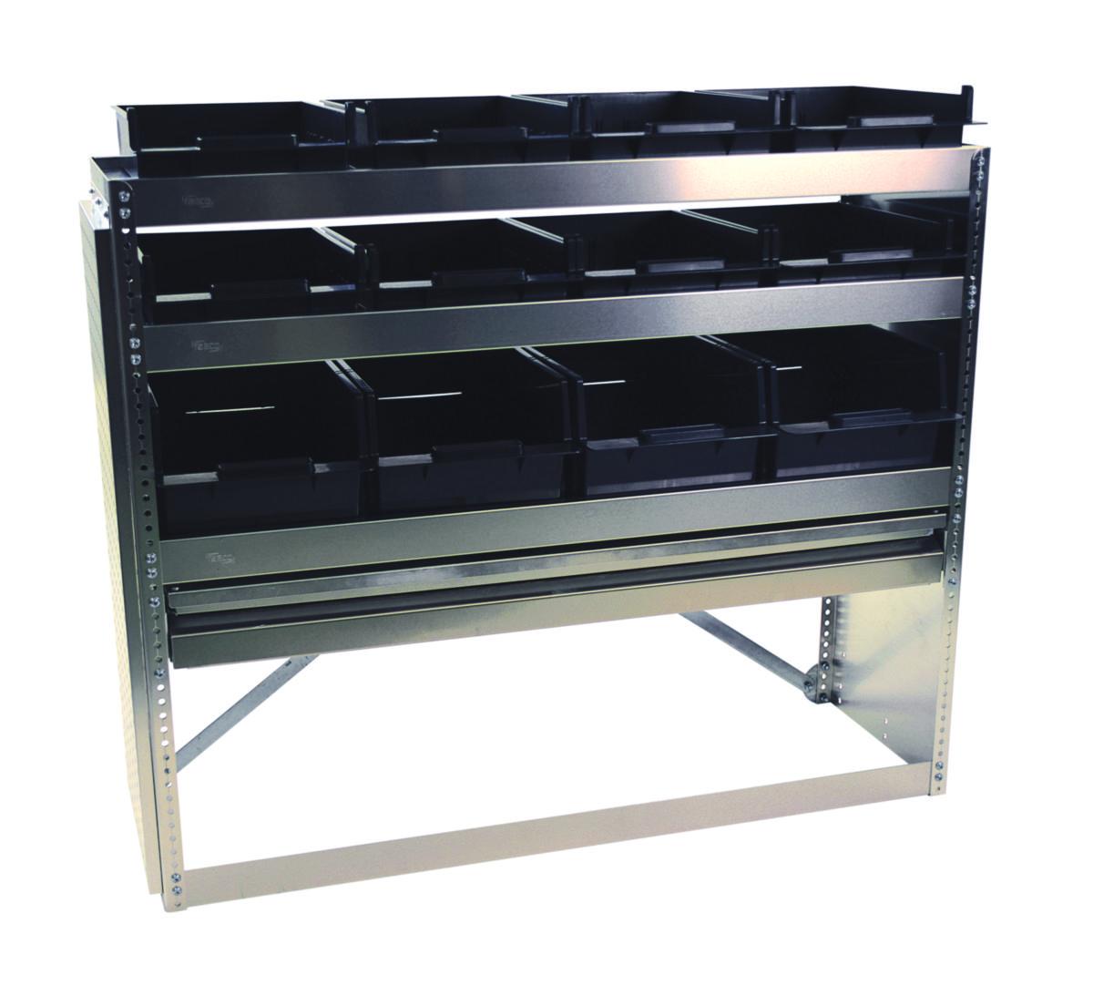 Alumiininen Fixx- hyllykkö autoon. Toimitetaan 12:lla muovilaatikolla, 1:llä vetolaatikolla, työkalulevyllä sekä 2:lla työkalupidikkeellä.