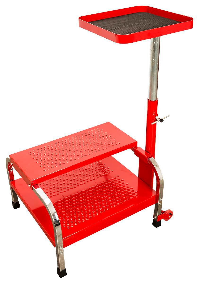 Porrasjakkara, jossa on apupöytä – täydellinen apuväline korkeiden autojen pesemiseen tai kiillottamiseen. Varustettu apupöydällä, jota voidaan nostaa ja laskea, ja kahdella pyörällä, jotka helpottavat liikkumista. Työkorkeus 400 mm, leveys 560 mm.
